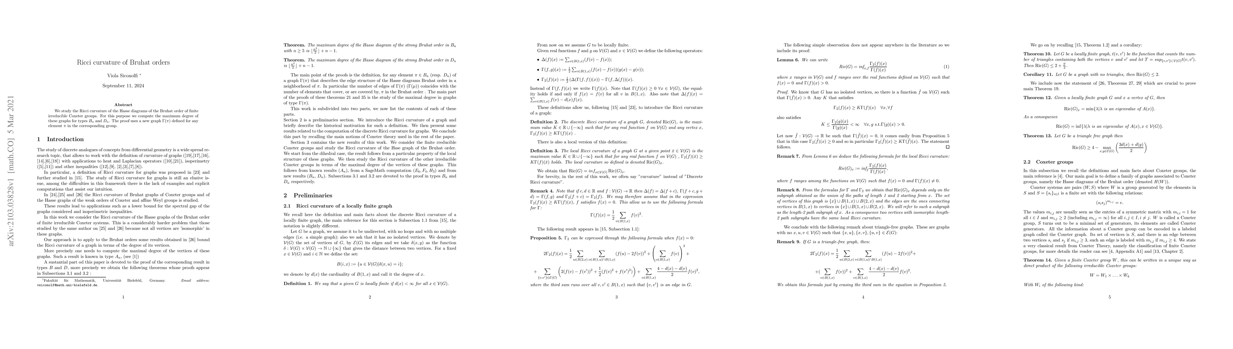 We study the Ricci curvature of the Hasse diagrams of the Bruhat order of finite irreducible Coxeter groups. For this purpose we compute the maximum degree of these graphs for types $B_n$ and $D_n$. The proof uses a new graph $\Gamma(\pi)$ defined for any element $\pi$ in the corresponding group.