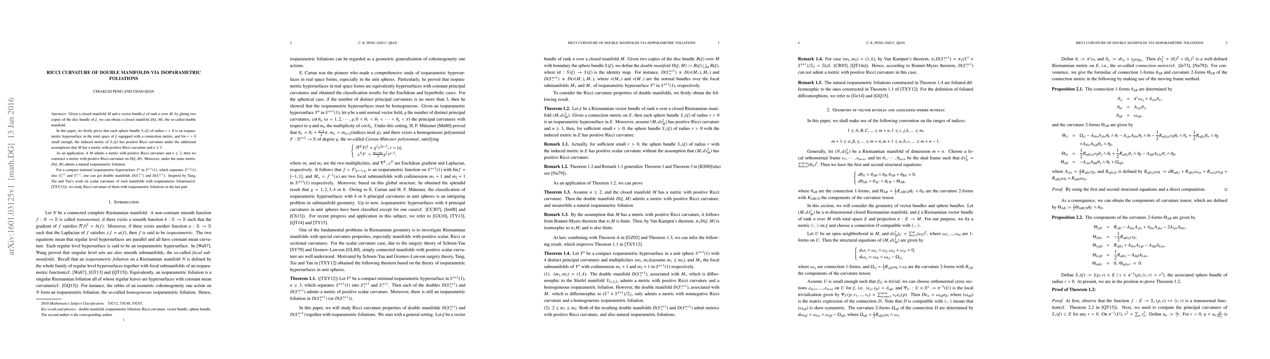 This paper proves that sphere bundles of a vector bundle over a closed manifold with positive Ricci curvature are isoparametric hypersurfaces with positive Ricci curvature under certain conditions. It constructs a metric with positive Ricci curvature on double manifolds derived from these bundles and explores Ricci curvature in double manifolds with isoparametric foliations.
