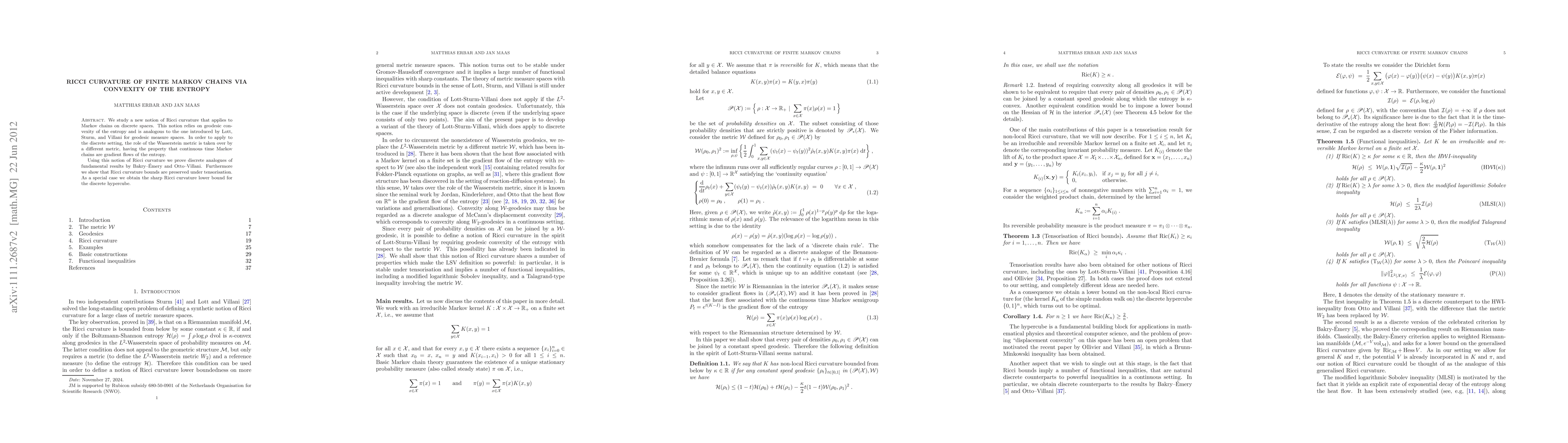 This paper introduces a new Ricci curvature notion for finite Markov chains based on entropy convexity, analogous to continuous geodesic measure spaces. It proves discrete analogues of Bakry-Emery and Otto-Villani results and shows that Ricci curvature bounds are preserved under tensorization, with a sharp lower bound for the hypercube.