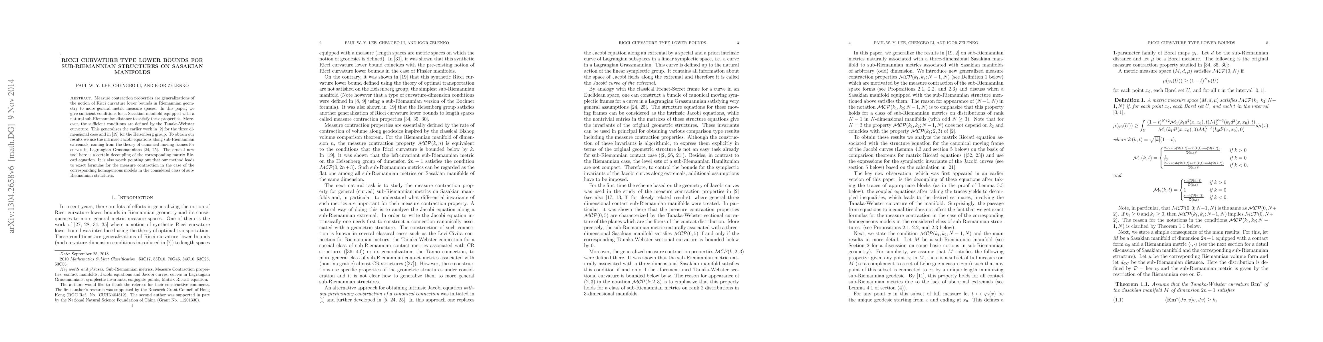 Measure contraction properties are generalizations of the notion of Ricci curvature lower bounds in Riemannian geometry to more general metric measure spaces. In this paper, we give sufficient conditions for a Sasakian manifold equipped with a natural sub-Riemannian distance to satisfy these properties. Moreover, the sufficient conditions are defined by the Tanaka-Webster curvature. This generalizes the earlier work in \cite{AgLe1} for the three dimensional case and in \cite{Ju} for the Heisenberg group. To obtain our results we use the intrinsic Jacobi equations along sub-Riemannian extremals, coming from the theory of canonical moving frames for curves in Lagrangian Grassmannians \cite{LiZe1, LiZe2}. The crucial new tool here is a certain decoupling of the corresponding matrix Riccati equation. It is also worth pointing out that our method leads to exact formulas for the measure contraction in the case of the corresponding homogeneous models in the considered class of sub-Riemannian structures.