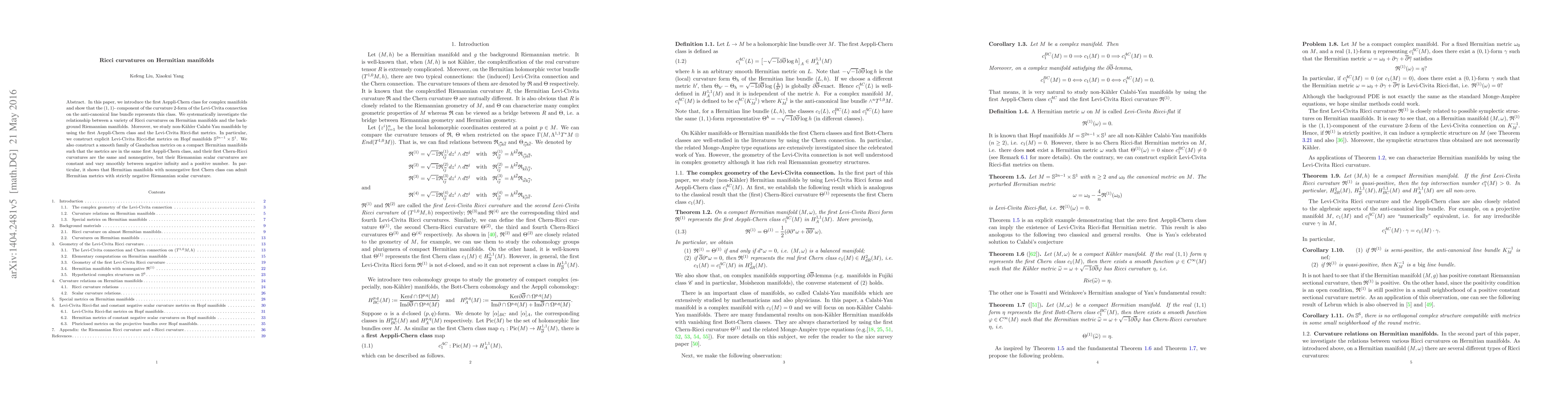 In this paper, we introduce the first Aeppli-Chern class for complex manifolds and show that the $(1,1)$- component of the curvature $2$-form of the Levi-Civita connection on the anti-canonical line bundle represents this class. We systematically investigate the relationship between a variety of Ricci curvatures on Hermitian manifolds and the background Riemannian manifolds. Moreover, we study non-K\"ahler Calabi-Yau manifolds by using the first Aeppli-Chern class and the Levi-Civita Ricci-flat metrics. In particular, we construct explicit Levi-Civita Ricci-flat metrics on Hopf manifolds $S^{2n-1}\times S^1$. We also construct a smooth family of Gauduchon metrics on a compact Hermitian manifolds such that the metrics are in the same first Aeppli-Chern class, and their first Chern-Ricci curvatures are the same and nonnegative, but their Riemannian scalar curvatures are constant and vary smoothly between negative infinity and a positive number. In particular, it shows that Hermitian manifolds with nonnegative first Chern class can admit Hermitian metrics with strictly negative Riemannian scalar curvature.