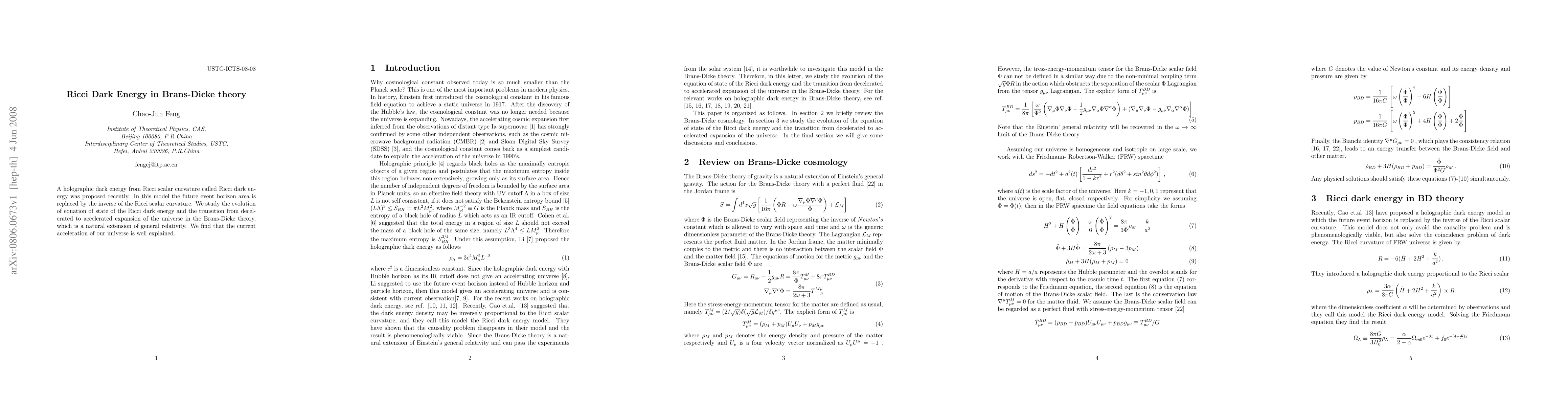 This paper investigates Ricci dark energy within the Brans-Dicke theory, demonstrating how it can replace the future event horizon area and explain the transition from decelerated to accelerated cosmic expansion, thus providing a plausible explanation for the current accelerated expansion of the universe.