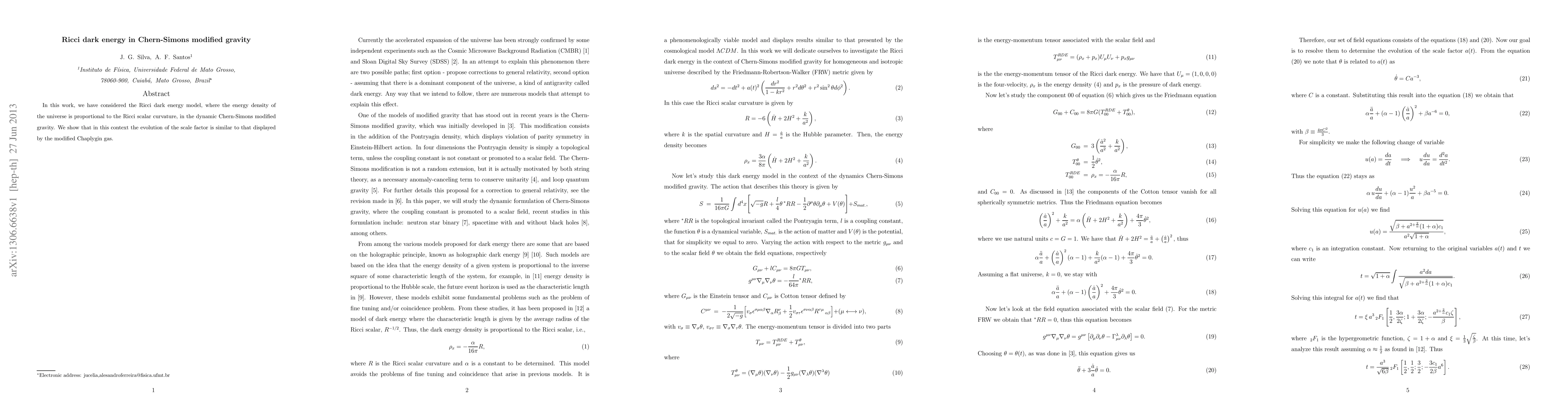 This paper explores the Ricci dark energy model within the framework of Chern-Simons modified gravity, demonstrating that the scale factor's evolution mirrors that of the modified Chaplygin gas. The study highlights the dynamic nature of dark energy in this theoretical context.