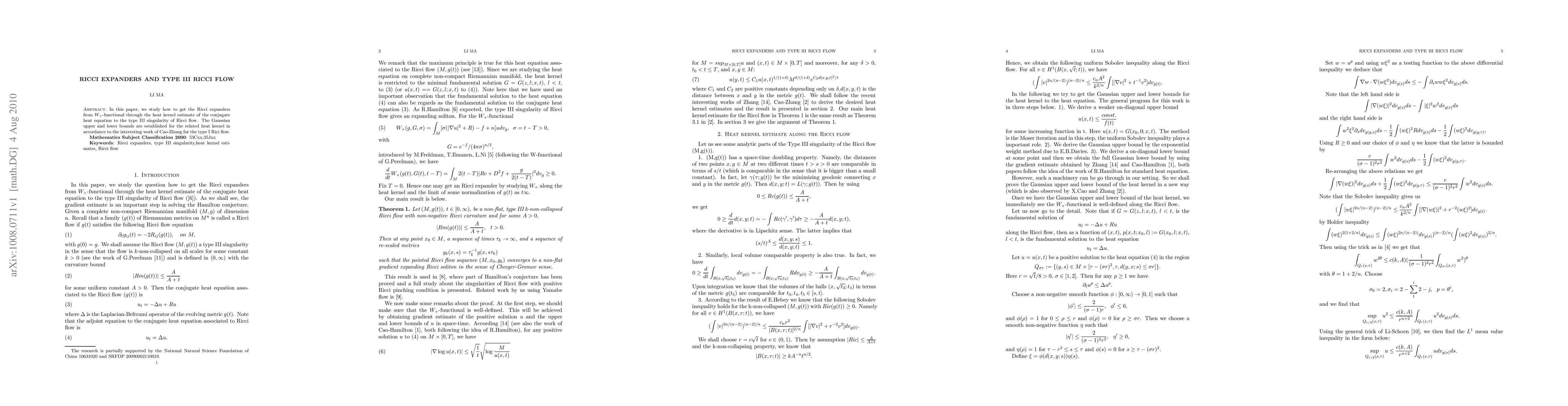 This paper investigates the derivation of Ricci expanders from the W+-functional via the heat kernel estimate for the conjugate heat equation, leading to insights on type III singularities in Ricci flow, with established Gaussian bounds for the associated heat kernel, inspired by Cao-Zhang's work on type I Ricci flow.