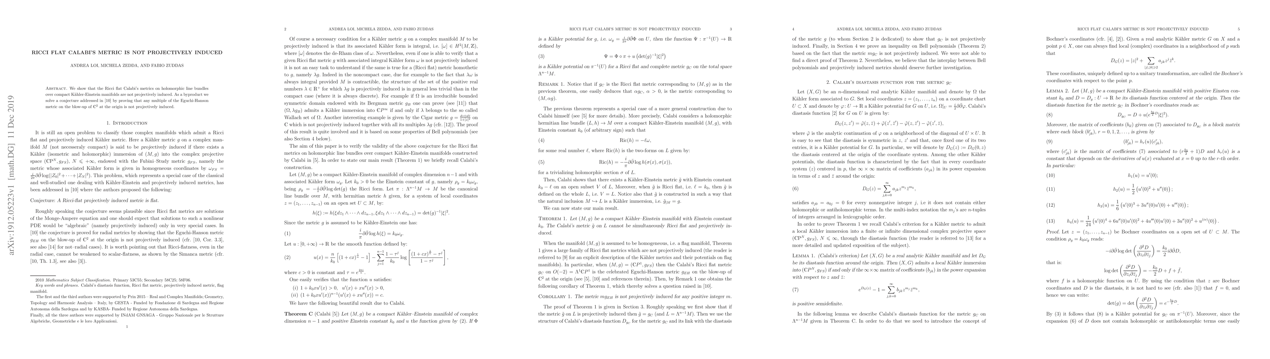 The research demonstrates that Ricci flat Calabi metrics on holomorphic line bundles over compact Kähler-Einstein manifolds do not arise from projectively induced metrics. Additionally, it resolves a conjecture by proving that multiples of the Eguchi-Hanson metric on the blow-up of \(\mathbb{C}^2\) at the origin are also not projectively induced.