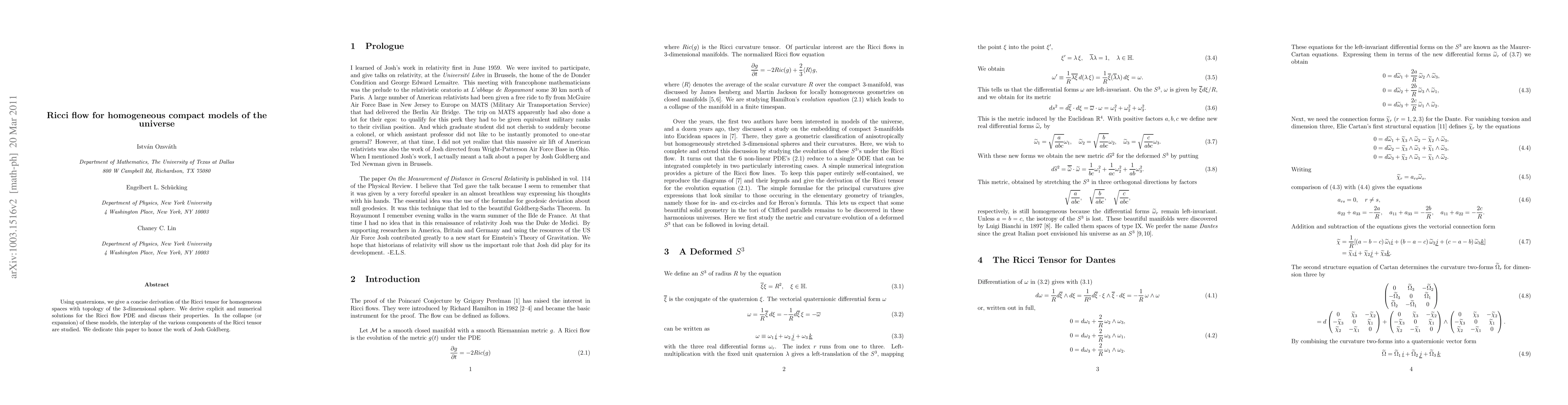 This paper derives Ricci tensors for homogeneous compact models of the universe using quaternions and explores the Ricci flow PDE, providing explicit and numerical solutions. It examines the dynamics of collapse or expansion, highlighting the interplay of Ricci tensor components, in honor of Josh Goldberg.