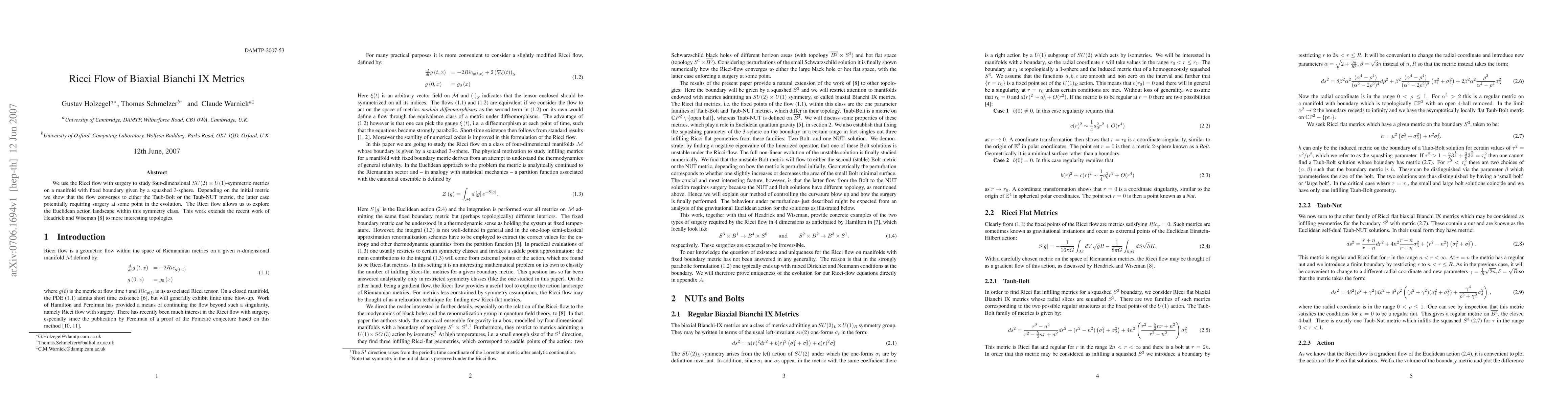We use the Ricci flow with surgery to study four-dimensional SU(2) x U(1)-symmetric metrics on a manifold with fixed boundary given by a squashed 3-sphere. Depending on the initial metric we show that the flow converges to either the Taub-Bolt or the Taub-NUT metric, the latter case potentially requiring surgery at some point in the evolution. The Ricci flow allows us to explore the Euclidean action landscape within this symmetry class. This work extends the recent work of Headrick and Wiseman to more interesting topologies.
