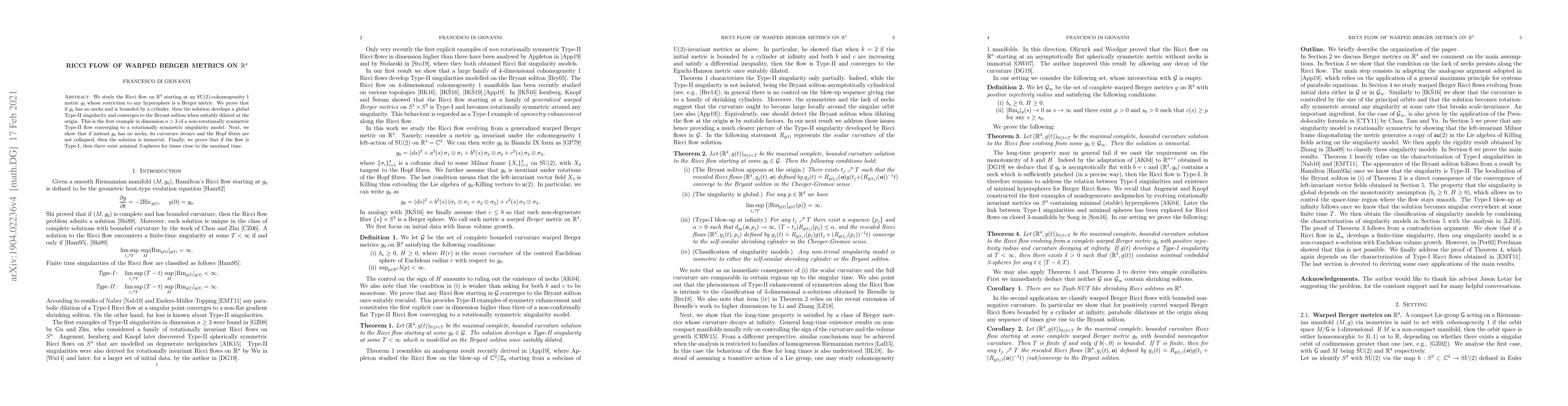 We study the Ricci flow on $\mathbb{R}^{4}$ starting at an SU(2)-cohomogeneity 1 metric $g_{0}$ whose restriction to any hypersphere is a Berger metric. We prove that if $g_{0}$ has no necks and is bounded by a cylinder, then the solution develops a global Type-II singularity and converges to the Bryant soliton when suitably dilated at the origin. This is the first example in dimension $n > 3$ of a non-rotationally symmetric Type-II flow converging to a rotationally symmetric singularity model. Next, we show that if instead $g_{0}$ has no necks, its curvature decays and the Hopf fibers are not collapsed, then the solution is immortal. Finally, we prove that if the flow is Type-I, then there exist minimal 3-spheres for times close to the maximal time.