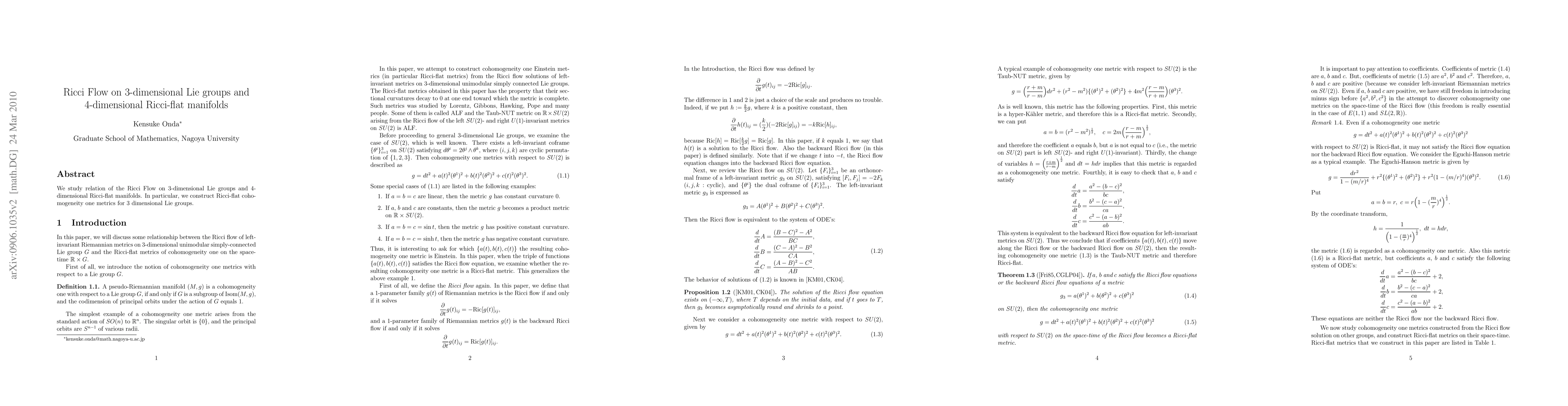 Summary: This paper investigates the connection between Ricci Flow on 3-dimensional Lie groups and 4-dimensional Ricci-flat manifolds, focusing on constructing Ricci-flat cohomogeneity one metrics associated with 3-dimensional Lie groups.
