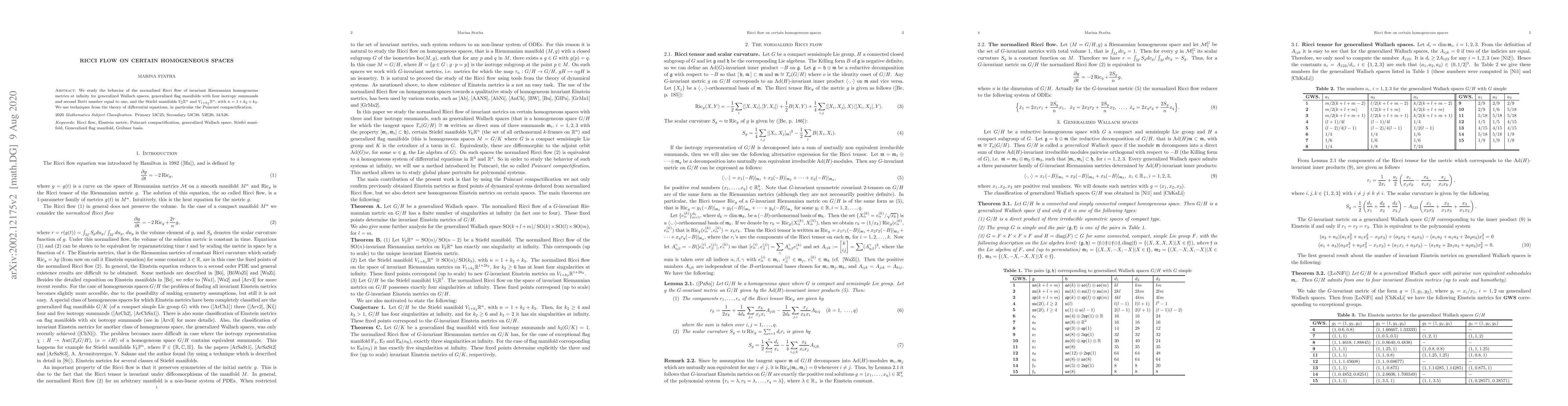 This paper investigates the normalized Ricci flow behavior on specific homogeneous spaces, including generalized Wallach spaces, flag manifolds, and Stiefel manifolds, employing differential equations techniques such as Poincaré compactification. The focus is on metrics at infinity with second Betti number one.