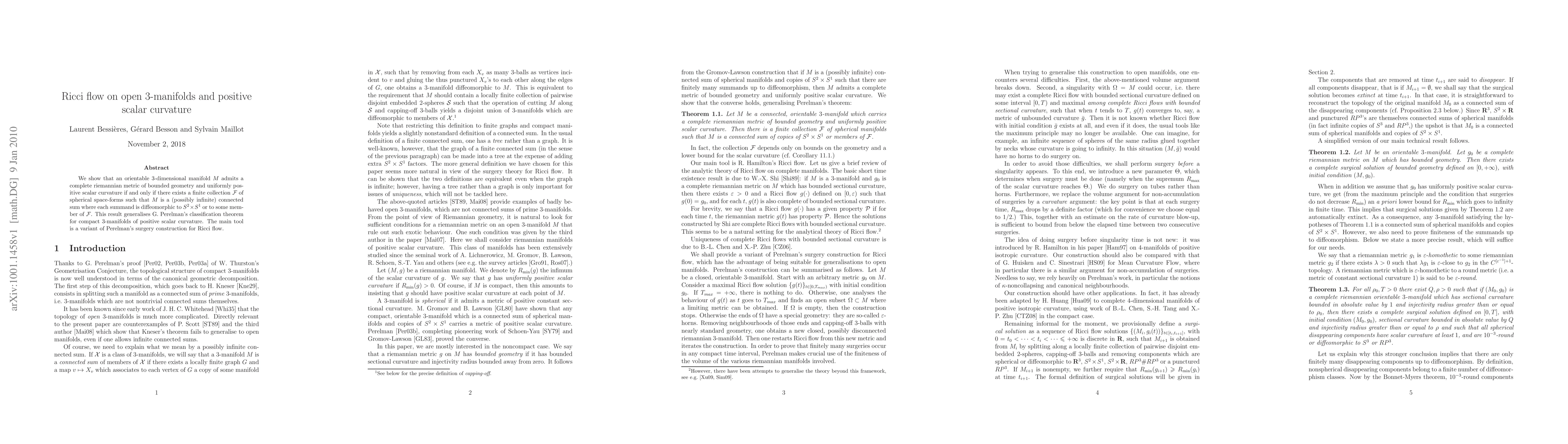 This paper demonstrates that an orientable 3-manifold can achieve a complete Riemannian metric with uniformly positive scalar curvature if it can be decomposed into a connected sum of spherical space-forms and specific 3-manifolds. The study uses a modified Ricci flow surgery technique to generalize Perelman's classification of compact 3-manifolds with positive scalar curvature.