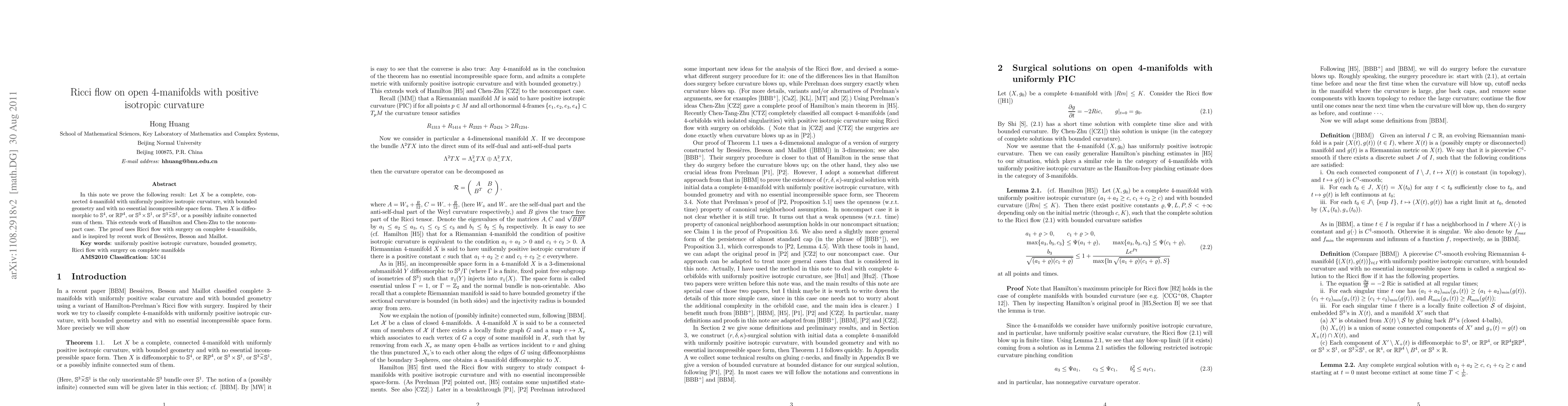 This paper demonstrates that a complete, connected 4-manifold with uniformly positive isotropic curvature and bounded geometry, lacking essential incompressible subspaces, is diffeomorphic to $\mathbb{S}^4$, $\mathbb{RP}^4$, $\mathbb{S}^3\times\mathbb{S}^1$, or $\mathbb{S}^3\widetilde{\times}\mathbb{S}^1$. The proof utilizes Ricci flow with surgery and extends previous results by Hamilton and Chen-Zhu to noncompact cases.