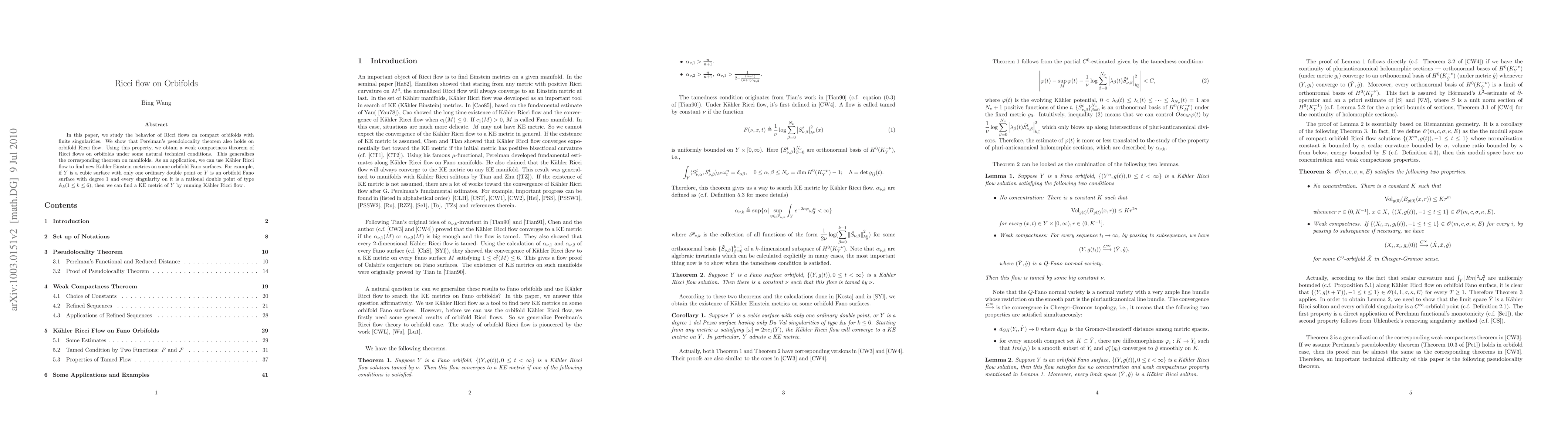 The paper investigates Ricci flows on compact orbifolds with finite singularities, demonstrating that Perelman's pseudolocality theorem applies. It establishes a weak compactness theorem for Ricci flows on orbifolds, generalizing the result for manifolds, and uses Kähler Ricci flow to find new Kähler Einstein metrics on specific orbifold Fano surfaces.