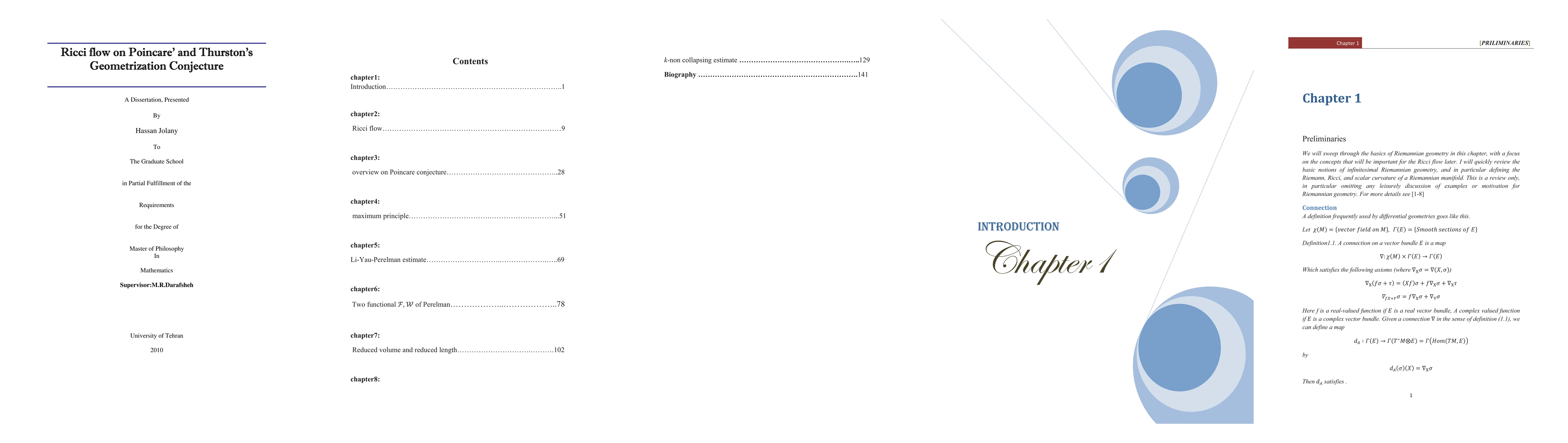 In this thesis we give a review on Ricci flow, an overview on Poincare conjecture, maximum principle, Li-Yau-Perelman estimate, Two functional F and W of Perelman, Reduced volume and reduced length and k-non collapsing estimate