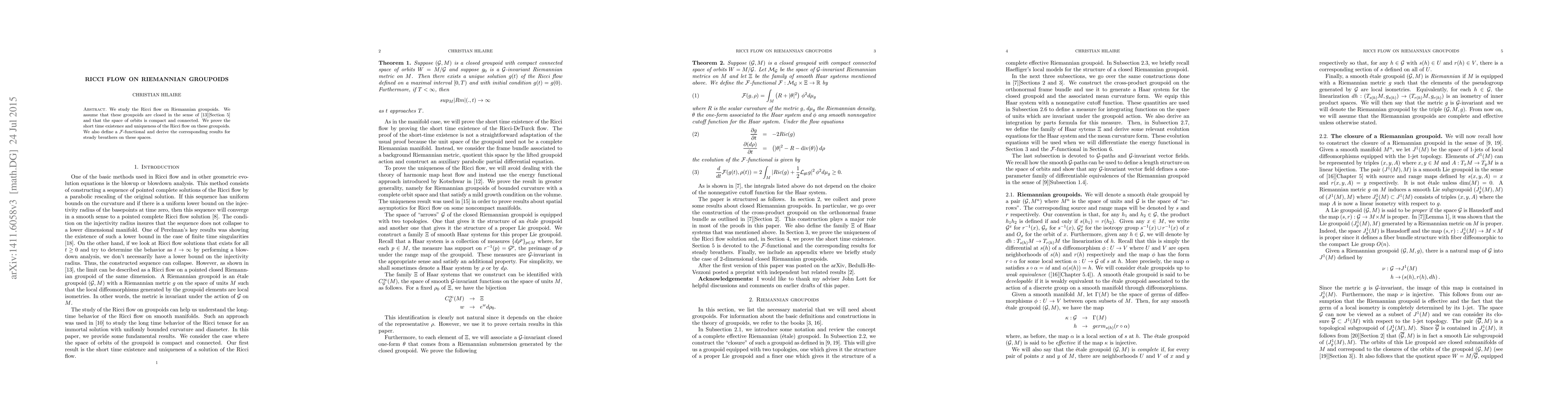 We study the Ricci flow on Riemannian groupoids. We assume that these groupoids are closed and that the space of orbits is compact and connected. We prove the short time existence and uniqueness of the Ricci flow on these groupoids. We also define a F-functional and derive the corresponding results for steady breathers on these spaces.