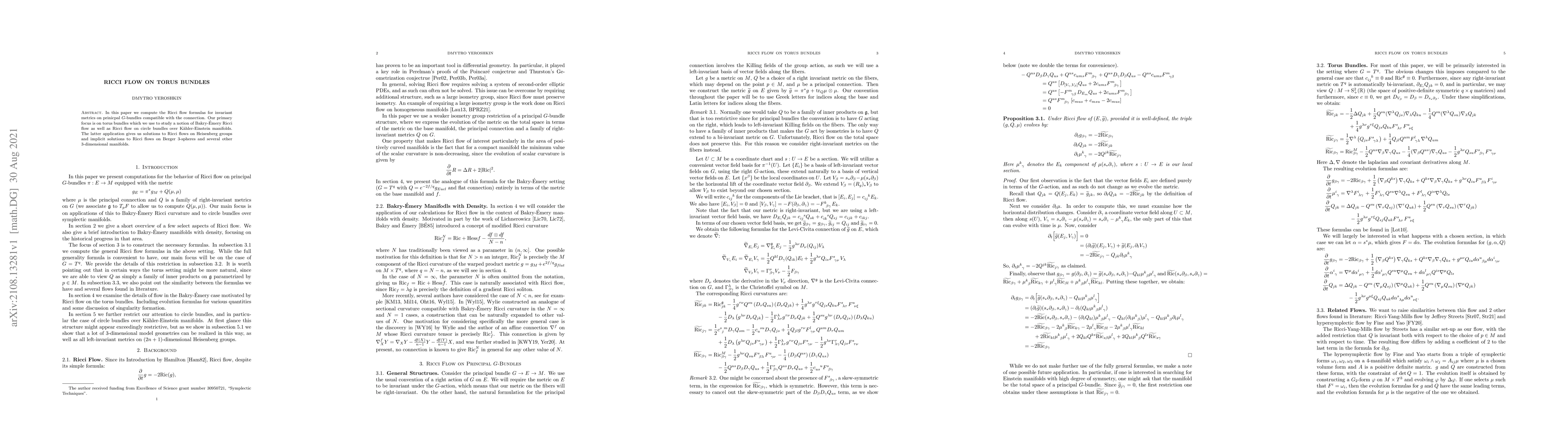 This paper computes Ricci flow formulas for invariant metrics on principal $G$-bundles, focusing on torus bundles to explore Bakry-Émery Ricci flow and Ricci flow on circle bundles over Kähler-Einstein manifolds, yielding solutions for Ricci flows on Heisenberg groups and Berger 3-spheres.