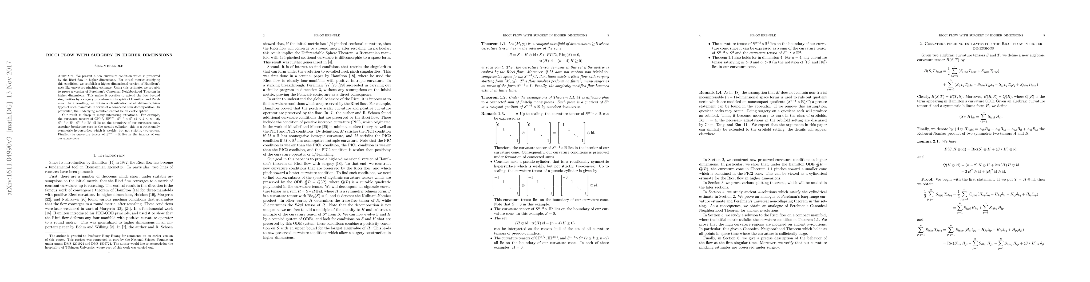 We present a new curvature condition which is preserved by the Ricci flow in higher dimensions. For initial metrics satisfying this condition, we establish a higher dimensional version of Hamilton's neck-like curvature pinching estimate. Using this estimate, we are able to prove a version of Perelman's Canonical Neighborhood Theorem in higher dimensions. This makes it possible to extend the flow beyond singularities by a surgery procedure in the spirit of Hamilton and Perelman. As a corollary, we obtain a classification of all diffeomorphism types of such manifolds in terms of a connected sum decomposition. In particular, the underlying manifold cannot be an exotic sphere. Our result is sharp in many interesting situations. For example, the curvature tensors of $\mathbb{CP}^{n/2}$, $\mathbb{HP}^{n/4}$, $S^{n-k} \times S^k$ ($2 \leq k \leq n-2$), $S^{n-2} \times \mathbb{H}^2$, $S^{n-2} \times \mathbb{R}^2$ all lie on the boundary of our curvature cone. Another borderline case is the pseudo-cylinder: this is a rotationally symmetric hypersurface which is weakly, but not strictly, two-convex. Finally, the curvature tensor of $S^{n-1} \times \mathbb{R}$ lies in the interior of our curvature cone.