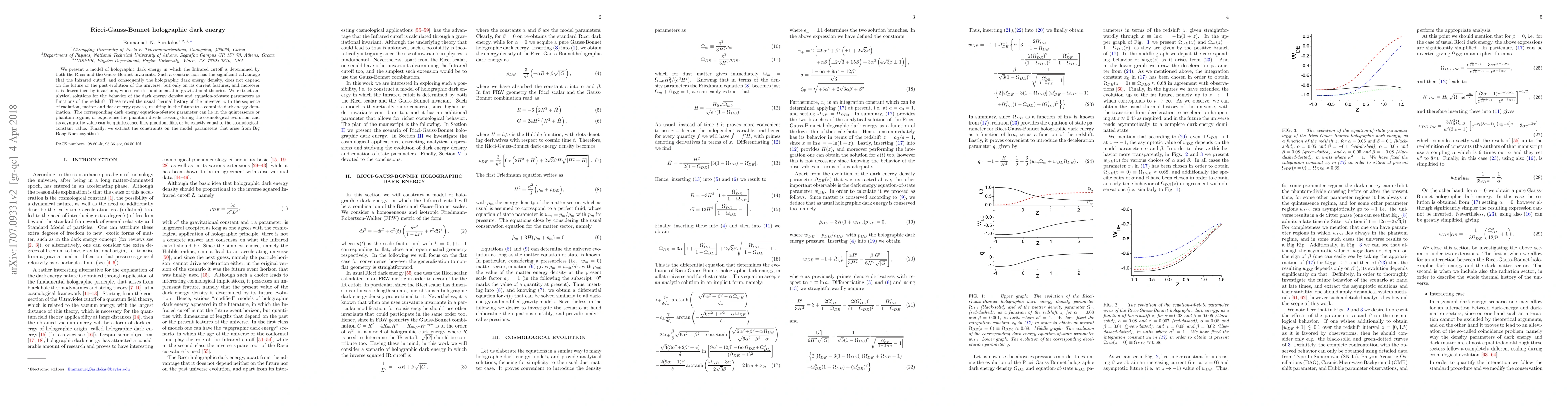 We present a model of holographic dark energy in which the Infrared cutoff is determined by both the Ricci and the Gauss-Bonnet invariants. Such a construction has the significant advantage that the Infrared cutoff, and consequently the holographic dark energy density, does not depend on the future or the past evolution of the universe, but only on its current features, and moreover it is determined by invariants, whose role is fundamental in gravitational theories. We extract analytical solutions for the behavior of the dark energy density and equation-of-state parameters as functions of the redshift. These reveal the usual thermal history of the universe, with the sequence of radiation, matter and dark energy epochs, resulting in the future to a complete dark energy domination. The corresponding dark energy equation-of-state parameter can lie in the quintessence or phantom regime, or experience the phantom-divide crossing during the cosmological evolution, and its asymptotic value can be quintessence-like, phantom-like, or be exactly equal to the cosmological-constant value. Finally, we extract the constraints on the model parameters that arise from Big Bang Nucleosynthesis.