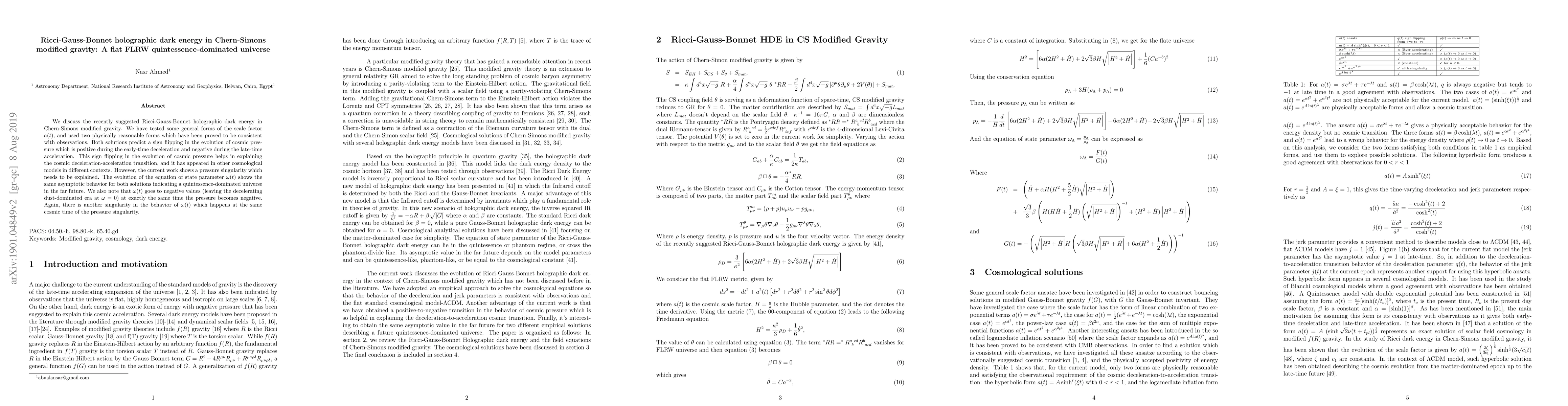 We discuss the recently suggested Ricci-Gauss-Bonnet holographic dark energy in Chern-Simons modified gravity. We have tested some general forms of the scale factor $a(t)$, and used two physically reasonable forms which have been proved to be consistent with observations. Both solutions predict a sign flipping in the evolution of cosmic pressure which is positive during the early-time deceleration and negative during the late-time acceleration. This sign flipping in the evolution of cosmic pressure helps in explaining the cosmic deceleration-acceleration transition, and it has appeared in other cosmological models in different contexts. However, the current work shows a pressure singularity which needs to be explained. The evolution of the equation of state parameter $\omega(t)$ shows the same asymptotic behavior for both solutions indicating a quintessence-dominated universe in the far future. We also note that $\omega(t)$ goes to negative values (leaving the decelerating dust-dominated era at $\omega=0$) at exactly the same time the pressure becomes negative. Again, there is another singularity in the behavior of $\omega(t)$ which happens at the same cosmic time of the pressure singularity.