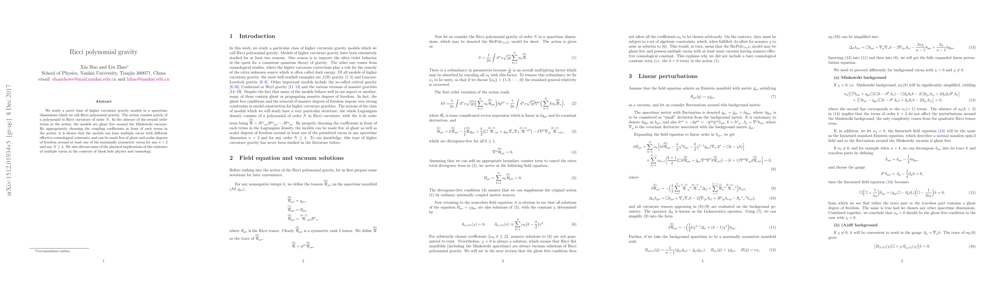 Ricci polynomial gravity models in n dimensions show multiple vacua with different effective cosmological constants, eliminating ghosts and scalar degrees of freedom around certain maximally symmetric vacua for any n > 2 and N >= 4.