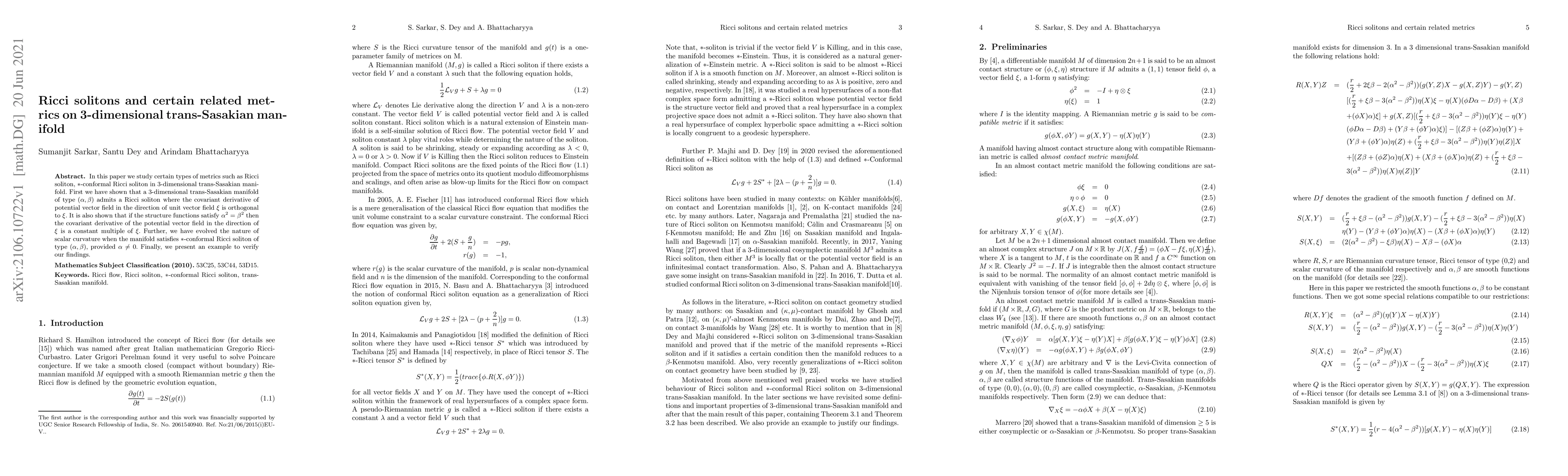 In this paper we study certain types of metrics such as Ricci soliton, $*$-conformal Ricci soliton in 3-dimensional trans-Sasakian manifold. First we have shown that a 3-dimensional trans-Sasakian manifold of type $(\alpha,\beta)$ admits a Ricci soliton where the covariant derivative of potential vector field in the direction of unit vector field $\xi$ is orthogonal to $\xi$. It is also shown that if the structure functions satisfy $\alpha^2=\beta^2$ then the covariant derivative of the potential vector field in the direction of $\xi$ is a constant multiple of $\xi$. Further, we have evolved the nature of scalar curvature when the manifold satisfies $*$-conformal Ricci soliton of type $(\alpha,\beta)$, provided $\alpha \neq 0$. Finally, we present an example to verify our findings.