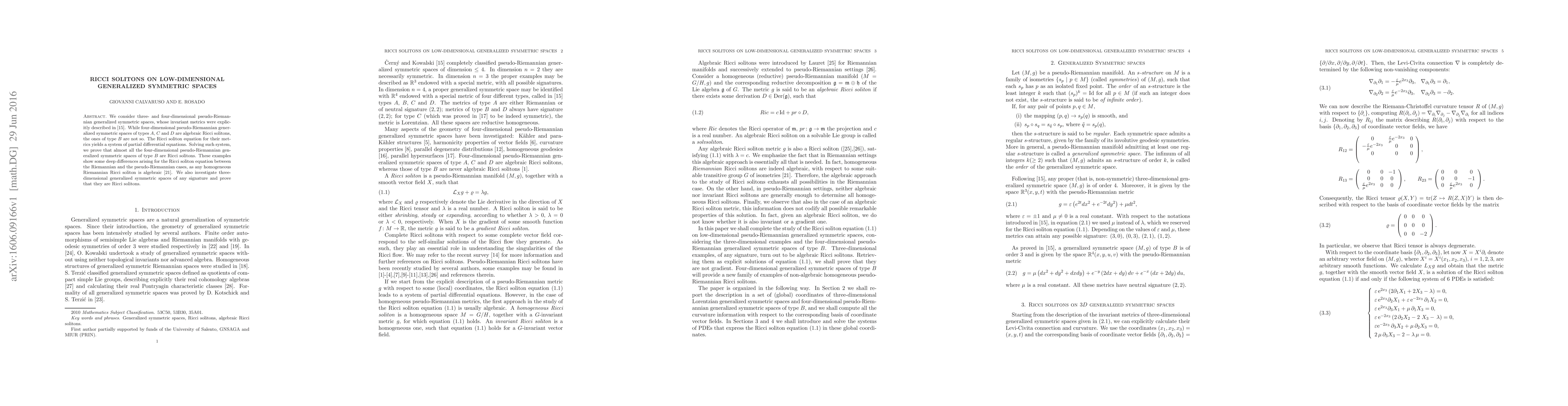 This paper investigates Ricci solitons on three- and four-dimensional generalized symmetric spaces, finding that four-dimensional pseudo-Riemannian spaces of type B are Ricci solitons despite initial expectations. It highlights differences in the Ricci soliton equation between Riemannian and pseudo-Riemannian cases.