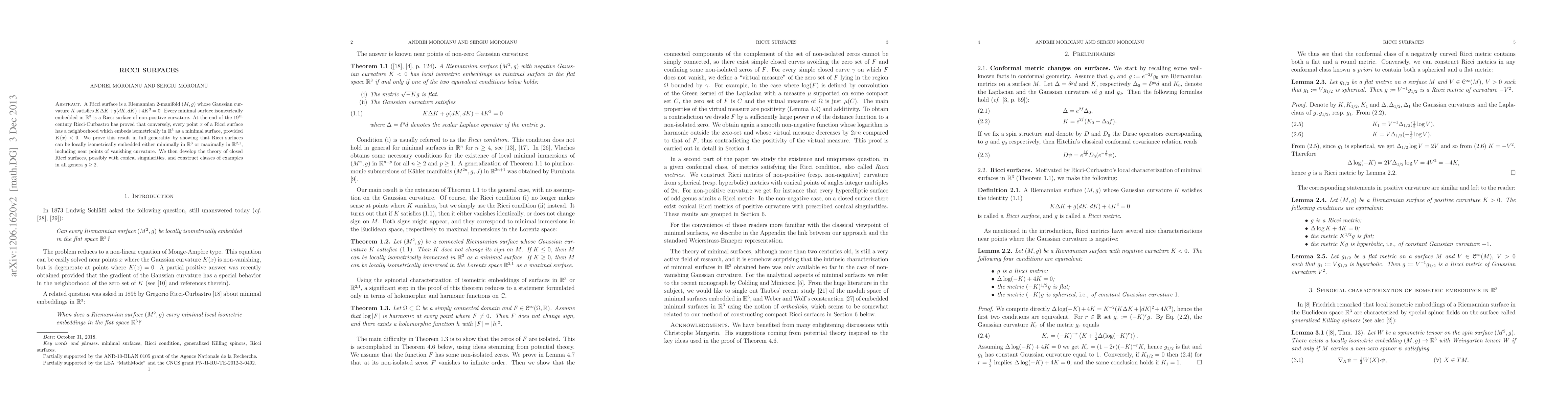 A Ricci surface is a Riemannian 2-manifold $(M,g)$ whose Gaussian curvature $K$ satisfies $K\Delta K+g(dK,dK)+4K^3=0$. Every minimal surface isometrically embedded in $\mathbb{R}^3$ is a Ricci surface of non-positive curvature. At the end of the 19th century Ricci-Curbastro has proved that conversely, every point $x$ of a Ricci surface has a neighborhood which embeds isometrically in $\mathbb{R}^3$ as a minimal surface, provided $K(x)<0$. We prove this result in full generality by showing that Ricci surfaces can be locally isometrically embedded either minimally in $\mathbb{R}^3$ or maximally in $\mathbb{R}^{2,1}$, including near points of vanishing curvature. We then develop the theory of closed Ricci surfaces, possibly with conical singularities, and construct classes of examples in all genera $g\geq 2$.