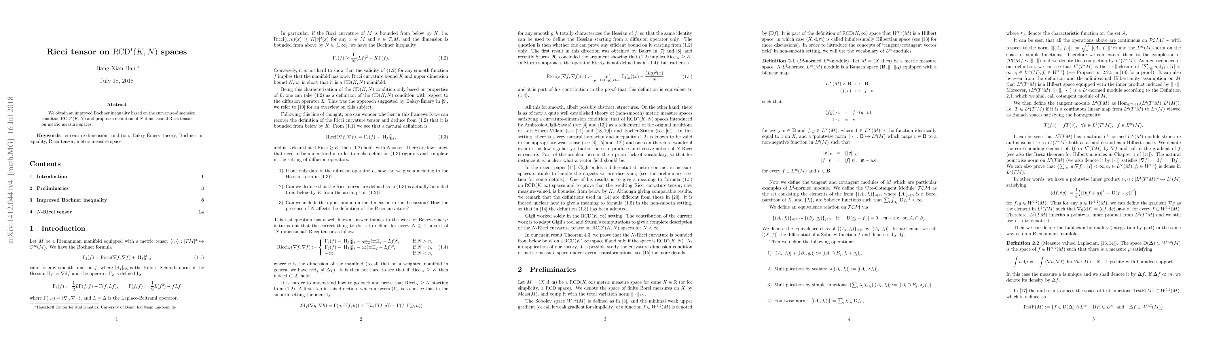 The paper introduces an improved Bochner inequality tailored for RCD*(K,N) spaces and defines an N-dimensional Ricci tensor, advancing the theory of curvature-dimension conditions in non-smooth geometric analysis.