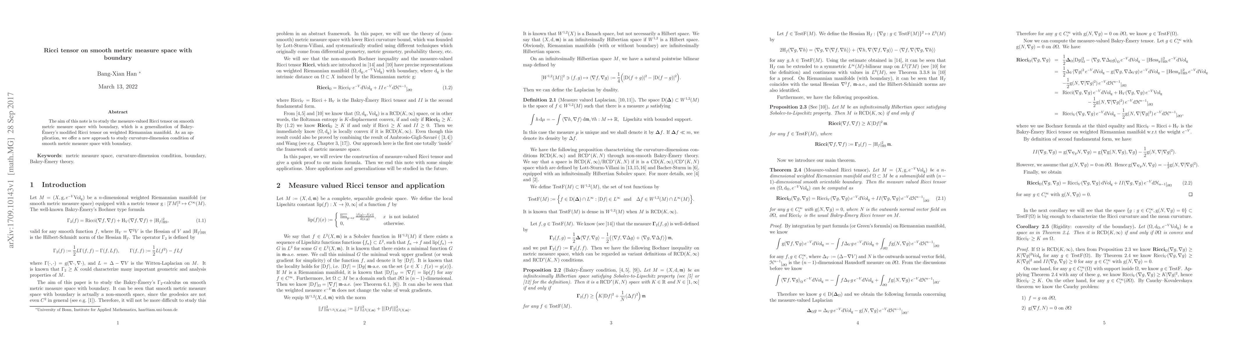 The aim of this note is to study the measure-valued Ricci tensor on smooth metric measure space with boundary, which is a generalization of Bakry-Emery's modified Ricci tensor on weighted Riemannian manifold. As an application, we offer a new approach to study curvature-dimension condition of smooth metric measure space with boundary.