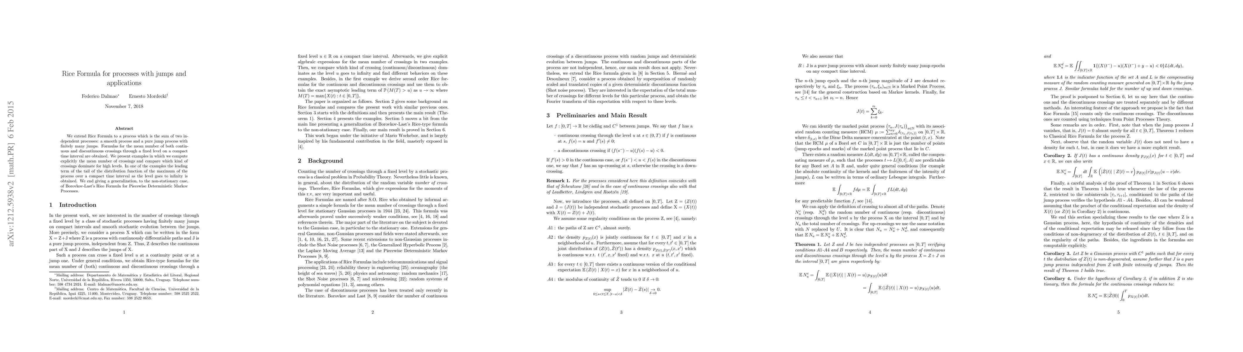 We extend Rice Formula to a process which is the sum of two independent processes: a smooth process and a pure jump process with finitely many jumps. Formulas for the mean number of both continuous and discontinuous crossings through a fixed level on a compact time interval are obtained. We present examples in which we compute explicitly the mean number of crossings and compare which kind of crossings dominate for high levels. In one of the examples the leading term of the tail of the distribution function of the maximum of the process over a compact time interval as the level goes to infinity is obtained. We end giving a generalization, to the non-stationary case, of Borovkov-Last Rice Formula for Piecewise Deterministic Markov Processes.