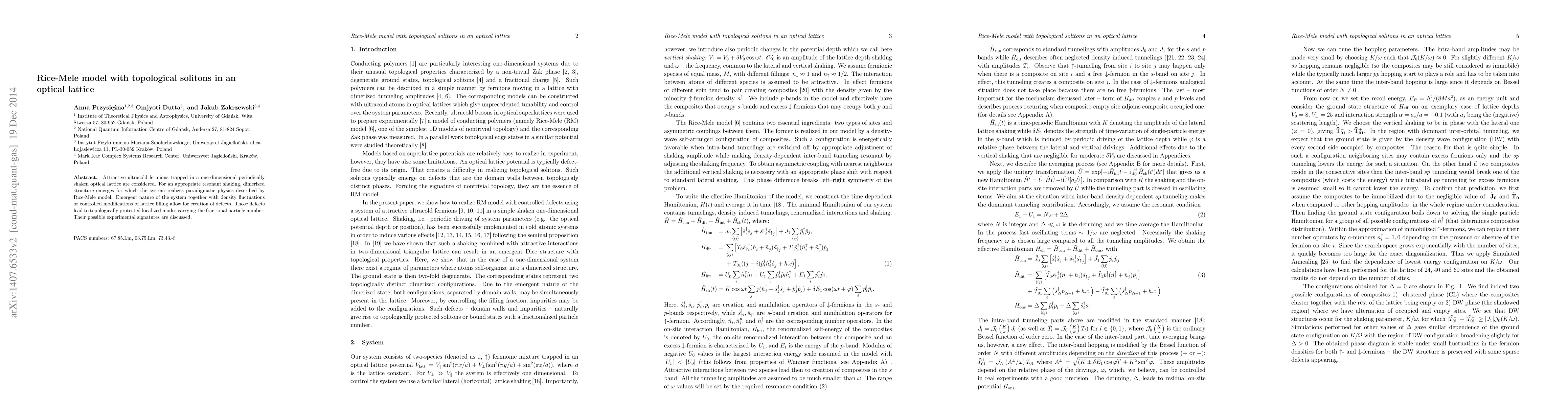 Attractive ultra-cold fermions trapped in a one-dimensional periodically shaken opticla lattices are considered. For an appropriate resonant shaking the system realizes paradigmatic dimes physics described by Rice-Mele model. The important feature of our system is the possible presence of controlled defects. They result in the creation of topologically protected loclaized modes carrying fractional particle number. Their possible experimental signatures are discussed.