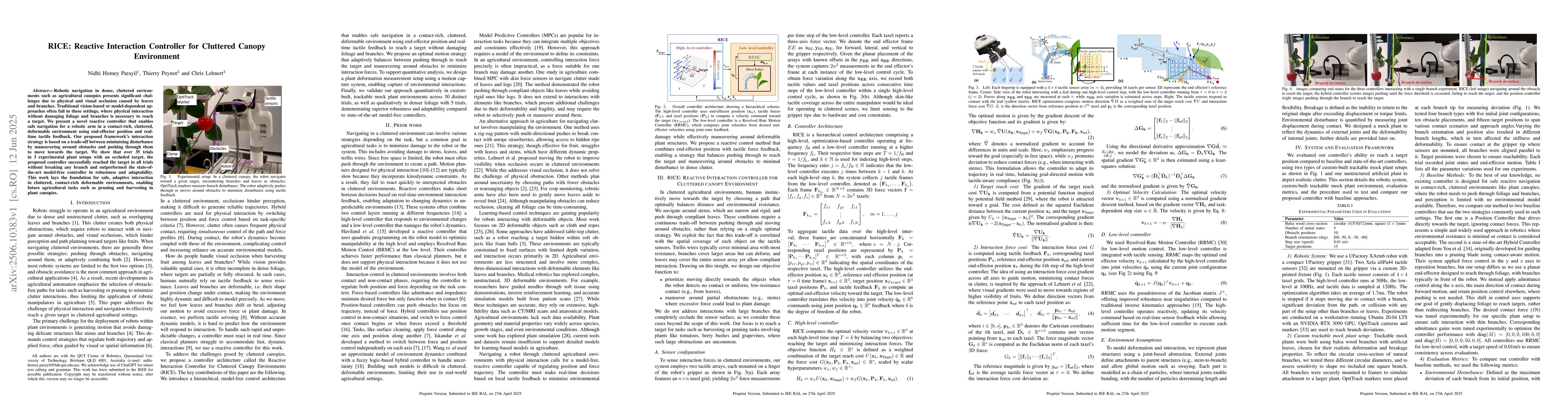 The research presents RICE, a reactive controller for safe navigation in cluttered, deformable environments like agricultural canopies. It combines end-effector position with real-time tactile feedback using a hierarchical control architecture.