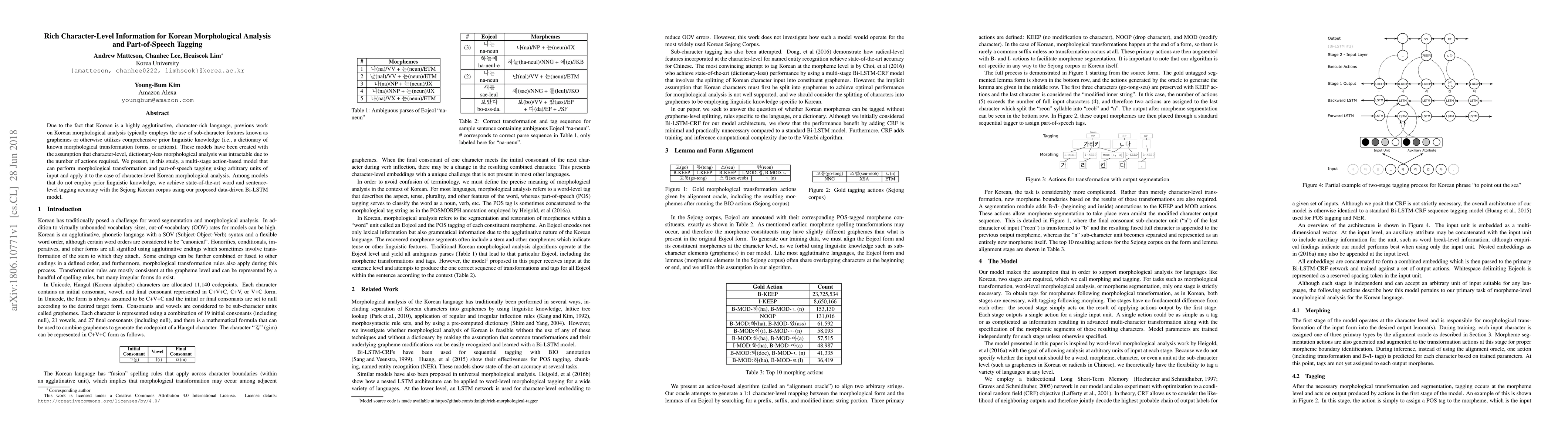 Due to the fact that Korean is a highly agglutinative, character-rich language, previous work on Korean morphological analysis typically employs the use of sub-character features known as graphemes or otherwise utilizes comprehensive prior linguistic knowledge (i.e., a dictionary of known morphological transformation forms, or actions). These models have been created with the assumption that character-level, dictionary-less morphological analysis was intractable due to the number of actions required. We present, in this study, a multi-stage action-based model that can perform morphological transformation and part-of-speech tagging using arbitrary units of input and apply it to the case of character-level Korean morphological analysis. Among models that do not employ prior linguistic knowledge, we achieve state-of-the-art word and sentence-level tagging accuracy with the Sejong Korean corpus using our proposed data-driven Bi-LSTM model.