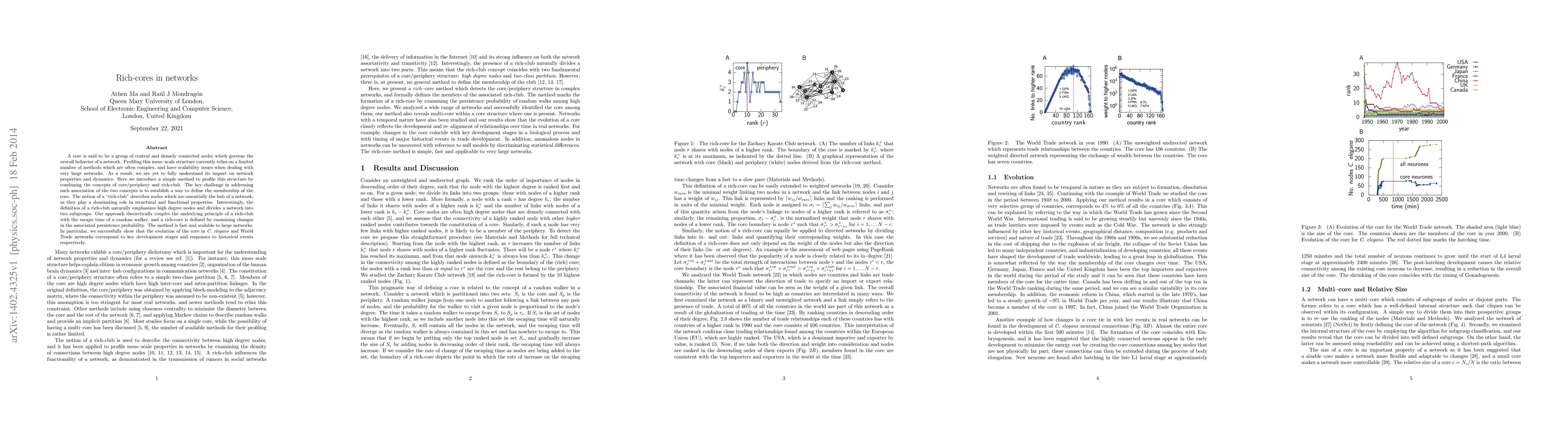 A core is said to be a group of central and densely connected nodes which governs the overall behavior of a network. Profiling this meso--scale structure currently relies on a limited number of methods which are often complex, and have scalability issues when dealing with very large networks. As a result, we are yet to fully understand its impact on network properties and dynamics. Here we introduce a simple method to profile this structure by combining the concepts of core/periphery and rich-club. The key challenge in addressing such association of the two concepts is to establish a way to define the membership of the core. The notion of a "rich-club" describes nodes which are essentially the hub of a network, as they play a dominating role in structural and functional properties. Interestingly, the definition of a rich-club naturally emphasizes high degree nodes and divides a network into two subgroups. Our approach theoretically couples the underlying principle of a rich-club with the escape time of a random walker, and a rich-core is defined by examining changes in the associated persistence probability. The method is fast and scalable to large networks. In particular, we successfully show that the evolution of the core in \emph{C. elegans} and World Trade networks correspond to key development stages and responses to historical events respectively.