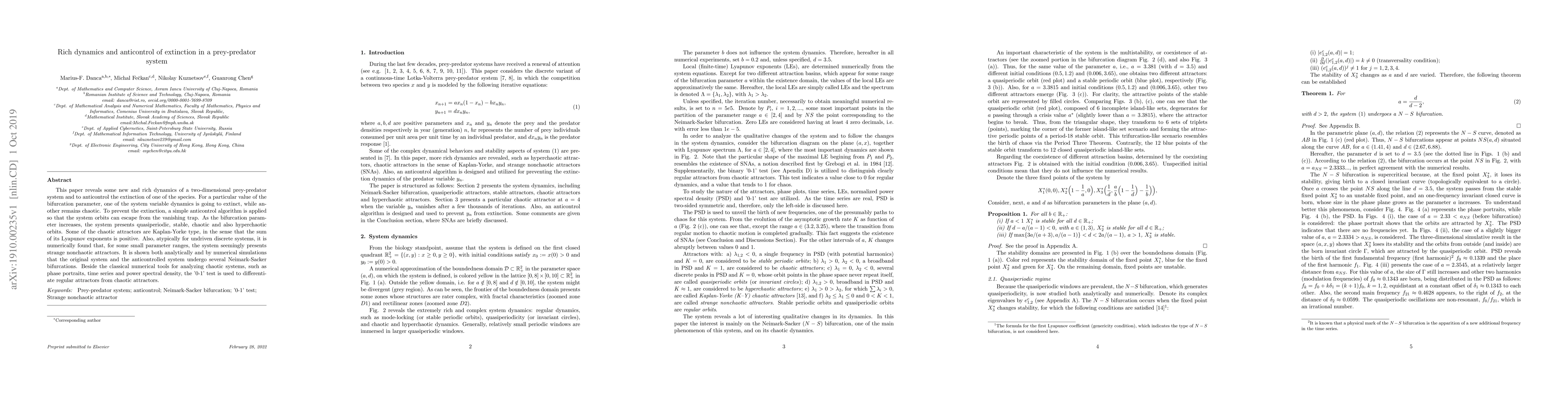 This paper reveals some new and rich dynamics of a two-dimensional prey-predator system and to anticontrol the extinction of one of the species. For a particular value of the bifurcation parameter, one of the system variable dynamics is going to extinct, while another remains chaotic. To prevent the extinction, a simple anticontrol algorithm is applied so that the system orbits can escape from the vanishing trap. As the bifurcation parameter increases, the system presents quasiperiodic, stable, chaotic and also hyperchaotic orbits. Some of the chaotic attractors are Kaplan-Yorke type, in the sense that the sum of its Lyapunov exponents is positive. Also, atypically for undriven discrete systems, it is numerically found that, for some small parameter ranges, the system seemingly presents strange nonchaotic attractors. It is shown both analytically and by numerical simulations that the original system and the anticontrolled system undergo several Neimark-Sacker bifurcations. Beside the classical numerical tools for analyzing chaotic systems, such as phase portraits, time series and power spectral density, the 0-1 test is used to differentiate regular attractors from chaotic attractors.