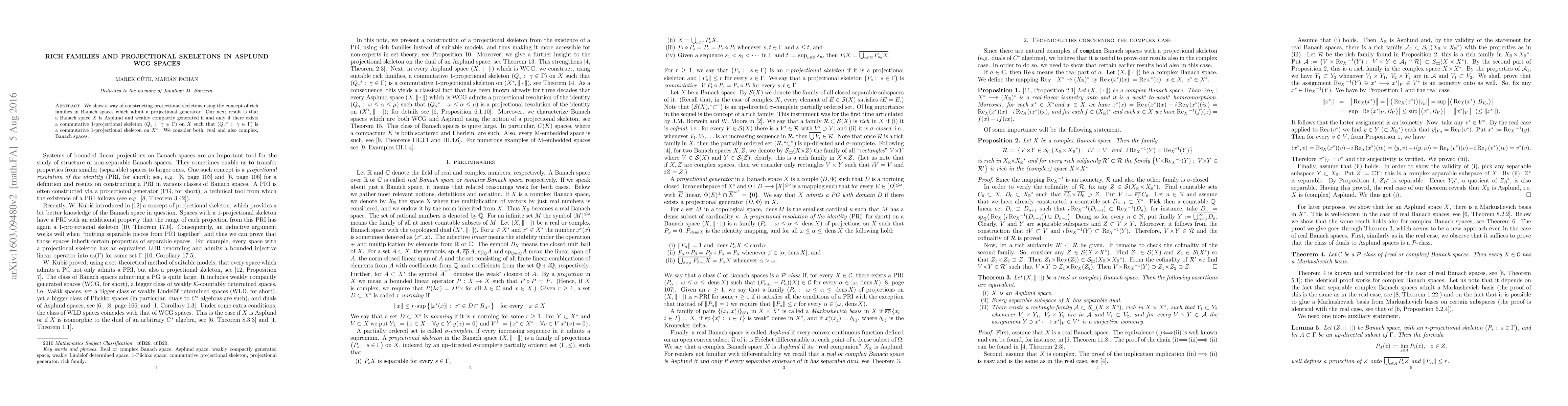 This paper constructs projectional skeletons using rich families in Banach spaces with a projectional generator, proving that a Banach space is Asplund and weakly compactly generated if it has a commutative 1-projectional skeleton whose dual is also a commutative 1-projectional skeleton. The results apply to both real and complex Banach spaces.