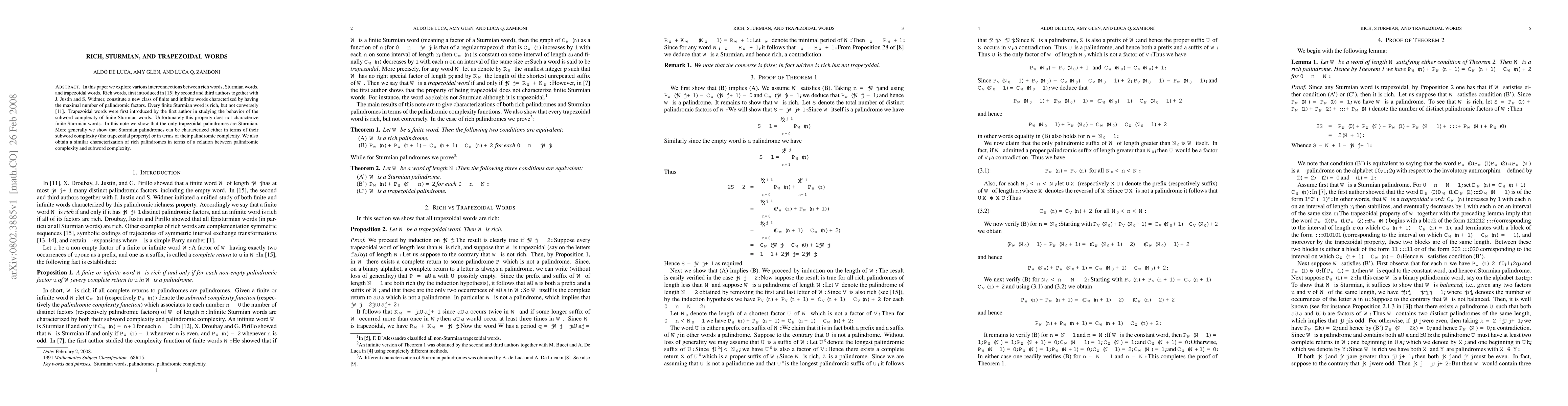 This paper investigates the relationships between rich words, Sturmian words, and trapezoidal words, showing that Sturmian palindromes are characterized by their subword complexity or palindromic complexity, and similarly, rich palindromes can be defined by a relation between these complexities.