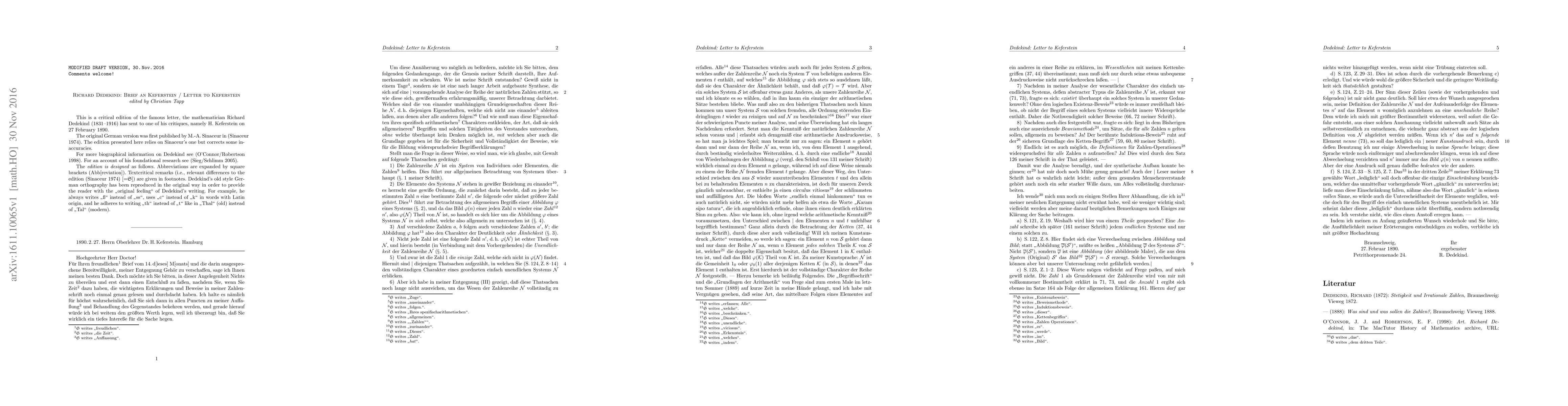 This is an edition of the famous letter by Richard Dedekind to H. Keferstein dated 27 February 1890