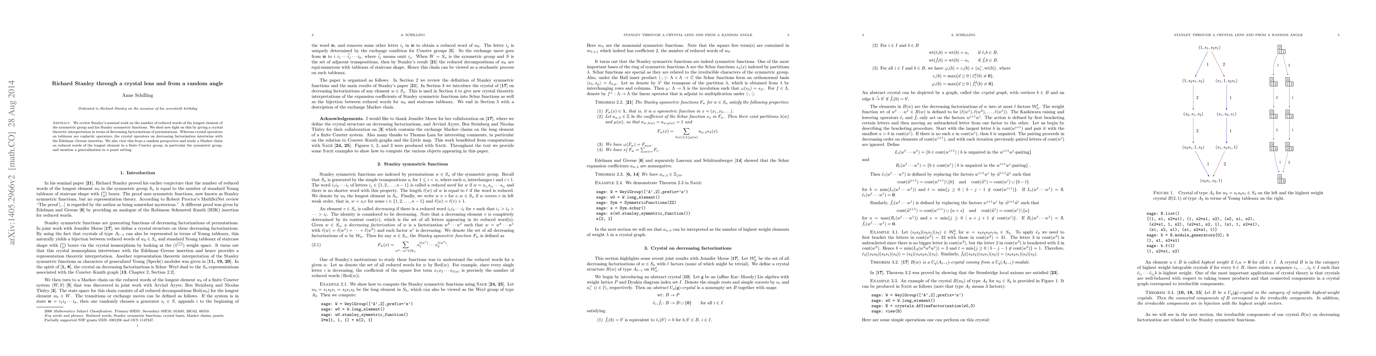 We review Stanley's seminal work on the number of reduced words of the longest element of the symmetric group and his Stanley symmetric functions. We shed new light on this by giving a crystal theoretic interpretation in terms of decreasing factorizations of permutations. Whereas crystal operators on tableaux are coplactic operators, the crystal operators on decreasing factorization intertwine with the Edelman-Greene insertion. We also view this from a random perspective and study a Markov chain on reduced words of the longest element in a finite Coxeter group, in particular the symmetric group, and mention a generalization to a poset setting.