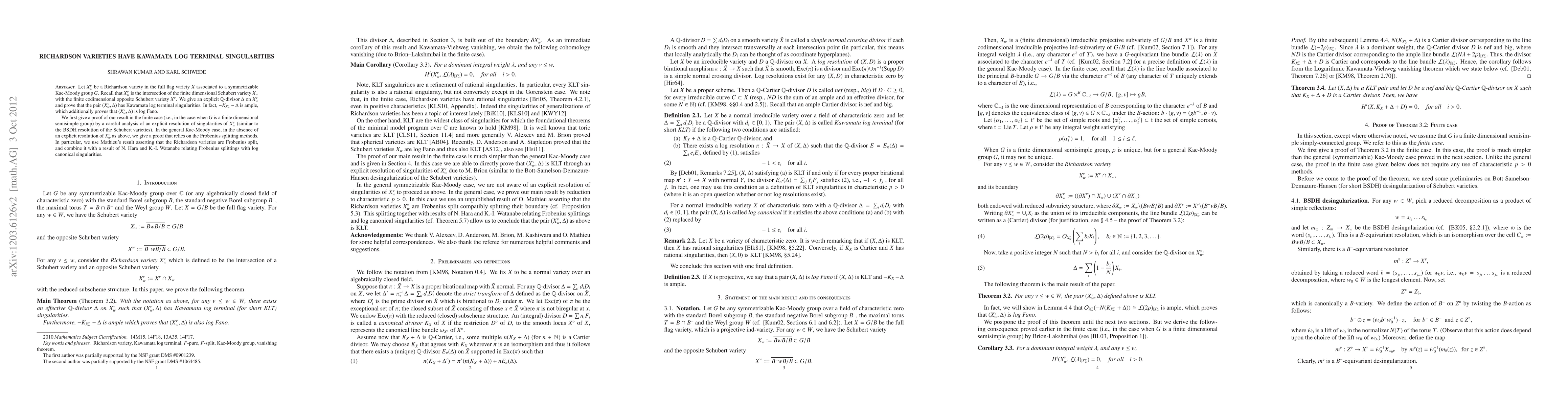 This paper demonstrates that Richardson varieties in the full flag variety have Kawamata log terminal singularities by constructing an explicit $\bQ$-divisor $\Delta$ on these varieties. It proves the log Fano property by showing $-K_{X^v_w} - \Delta$ is ample, utilizing Frobenius splitting methods for the general Kac-Moody case.