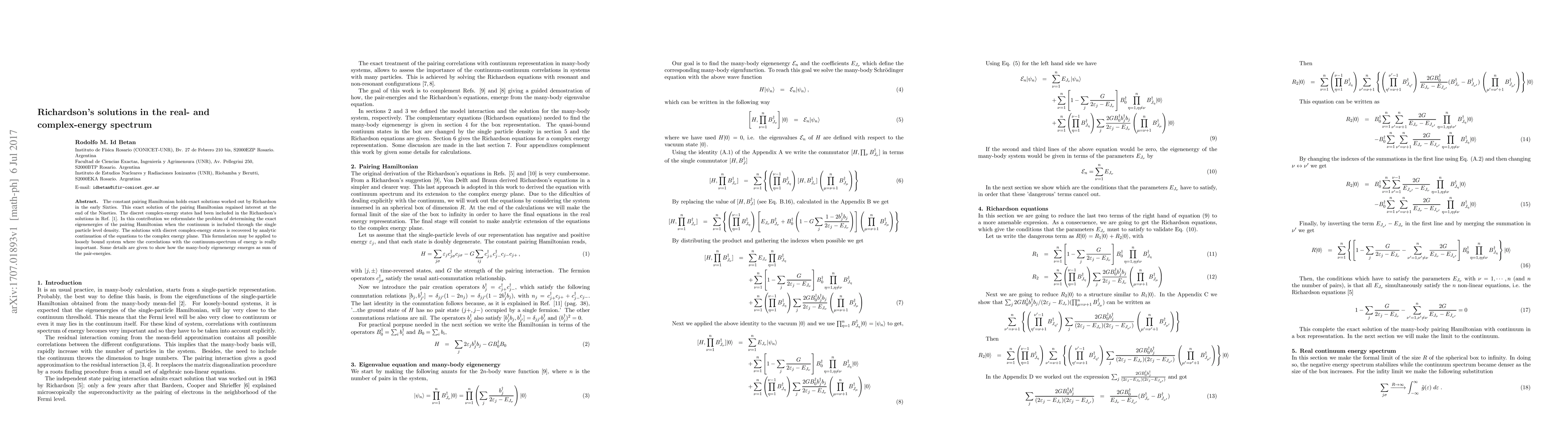 The constant pairing Hamiltonian holds exact solutions worked out by Richardson in the early Sixties. This exact solution of the pairing Hamiltonian regained interest at the end of the Nineties. The discret complex-energy states had been included in the Richardson's solutions by Hasegawa et al. [1]. In this contribution we reformulate the problem of determining the exact eigenenergies of the pairing Hamiltonian when the continuum is included through the single particle level density. The solutions with discret complex-energy states is recovered by analytic continuation of the equations to the complex energy plane. This formulation may be applied to loosely bound system where the correlations with the continuum-spectrum of energy is really important. Some details are given to show how the many-body eigenenergy emerges as sum of the pair-energies.