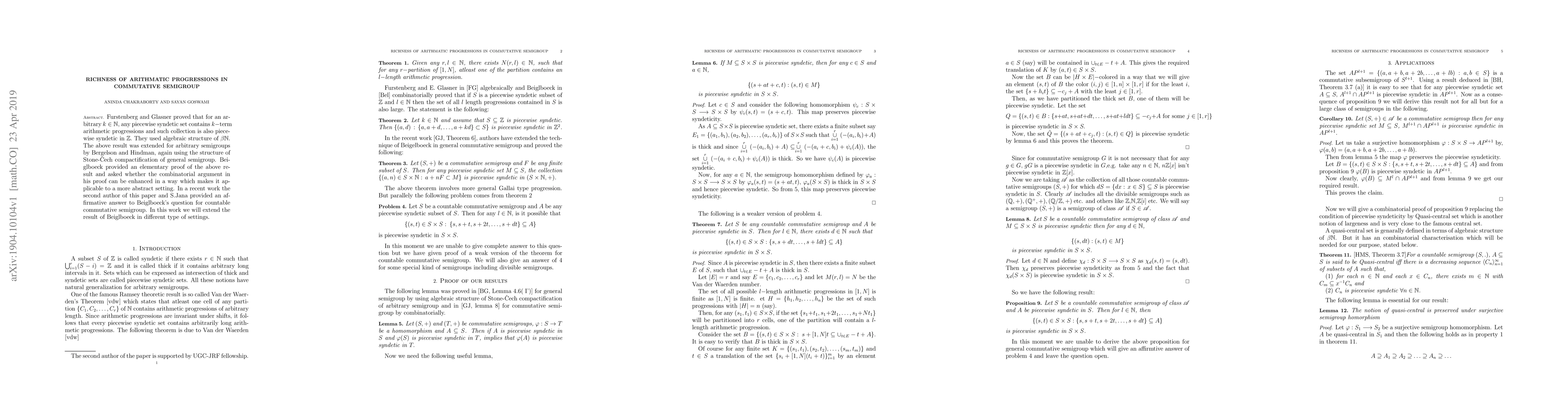 Research extends Beiglboeck's proof that countable commutative semigroups contain piecewise syndetic collections of term arithmetic progressions, paving the way for more abstract applications.
