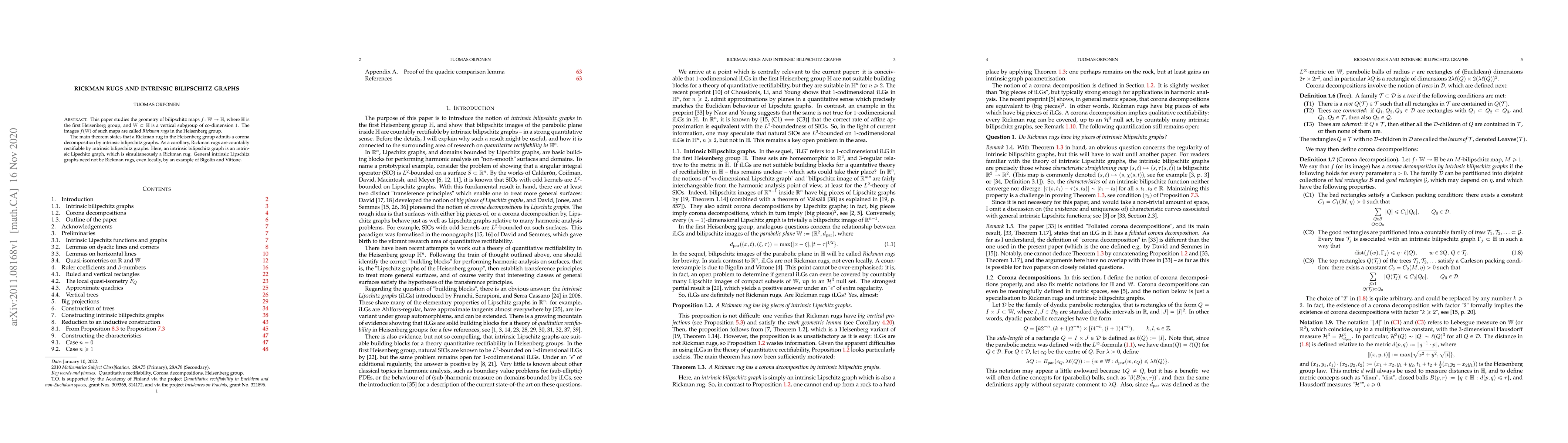 This paper explores the geometry of bilipschitz maps between the Heisenberg group and a vertical subgroup, defining Rickman rugs. The main theorem reveals that Rickman rugs can be decomposed into coronas of intrinsic bilipschitz graphs, implying they are countably rectifiable by such graphs.