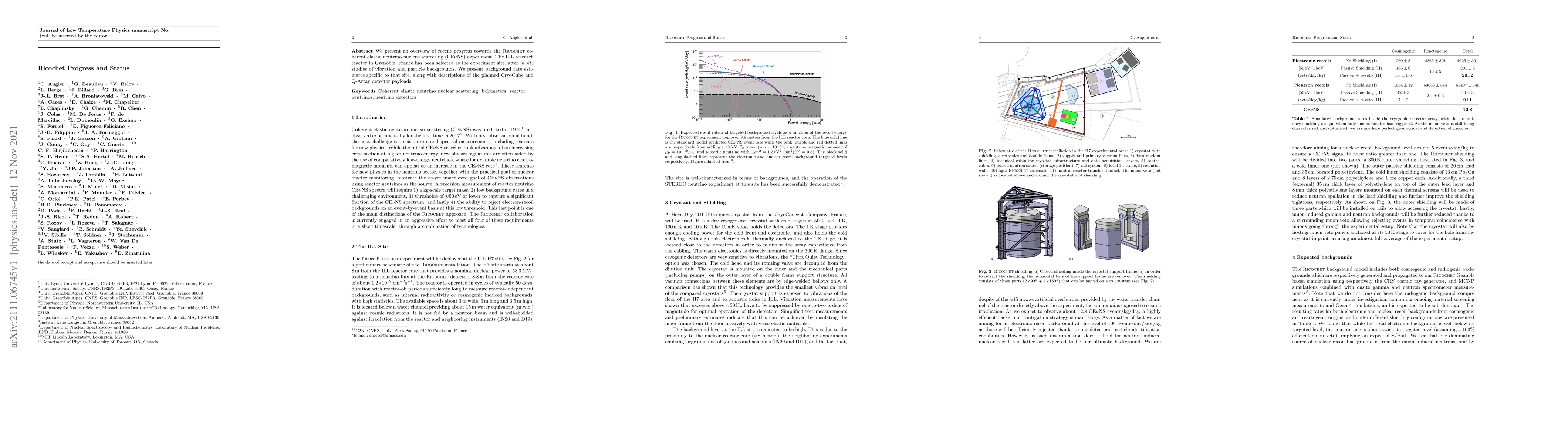 We present an overview of recent progress towards the Ricochet coherent elastic neutrino nucleus scattering CE$\nu$NS experiment. The ILL research reactor in Grenoble, France has been selected as the experiment site, after in situ studies of vibration and particle backgrounds. We present background rate estimates specific to that site, along with descriptions of the planned CryoCube and Q-Array detector payloads.