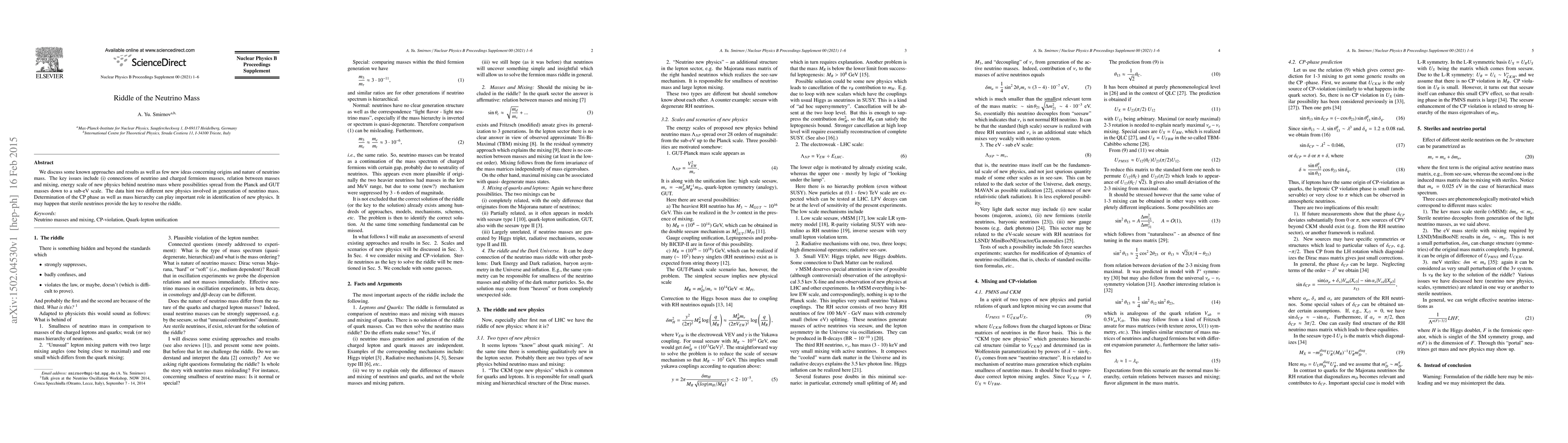 We discuss some known approaches and results as well as few new ideas concerning origins and nature of neutrino mass. The key issues include (i) connections of neutrino and charged fermions masses, relation between masses and mixing, energy scale of new physics behind neutrino mass where possibilities spread from the Planck and GUT masses down to a sub-eV scale. The data hint two different new physics involved in generation of neutrino mass. Determination of the CP phase as well as mass hierarchy can play important role in identification of new physics. It may happen that sterile neutrinos provide the key to resolve the riddle.