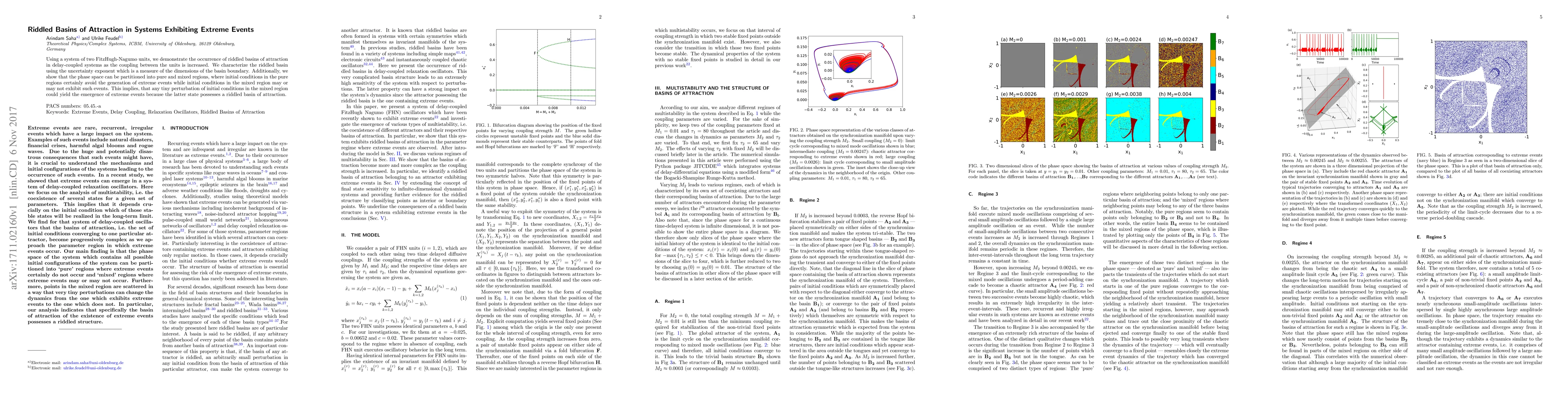This paper investigates the emergence of riddled basins of attraction in delay-coupled FitzHugh-Nagumo systems, characterized by the uncertainty exponent. It shows that the phase space comprises pure and mixed regions, where pure regions reliably avoid extreme events, while mixed regions, due to their riddled nature, can lead to extreme events with minor perturbations.