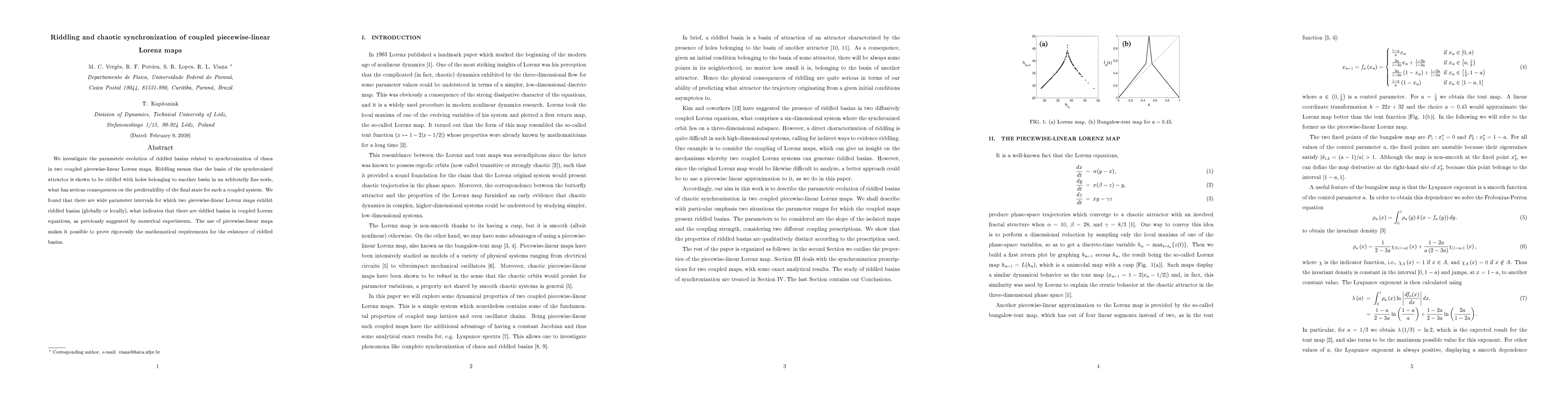 This paper explores the chaotic synchronization of two coupled piecewise-linear Lorenz maps, revealing the existence of riddled basins that are riddled with holes from other basins, severely impacting predictability. It rigorously proves the mathematical conditions for the emergence of these riddled basins in such systems.