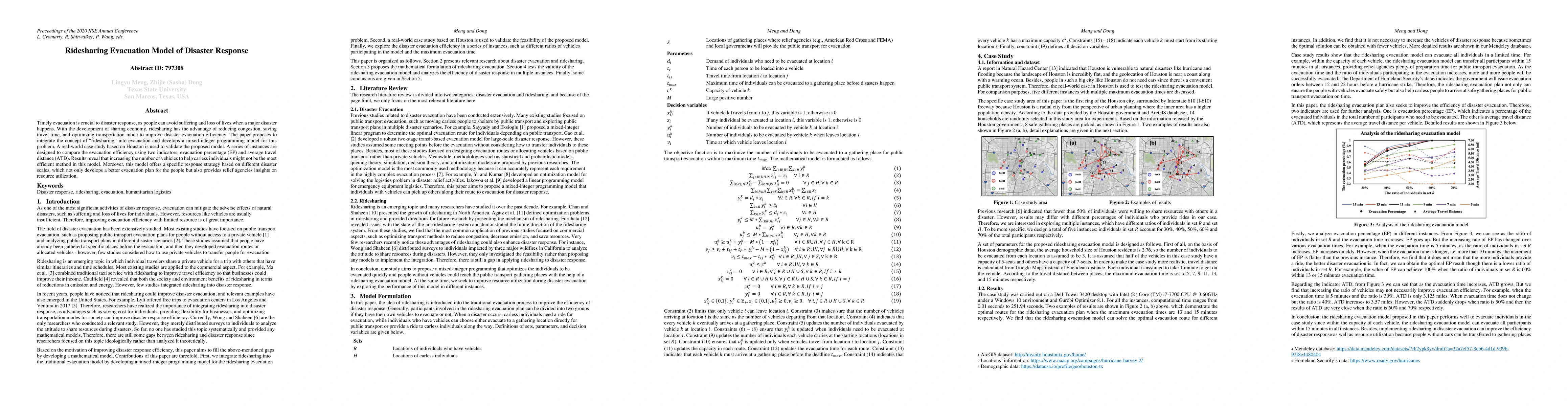 This paper proposes a mixed-integer programming model integrating ridesharing to enhance disaster evacuation efficiency, validated through a case study in Houston. Results show that increasing the number of vehicles may not always optimize evacuation, offering strategic insights for both evacuees and relief agencies based on disaster scale.