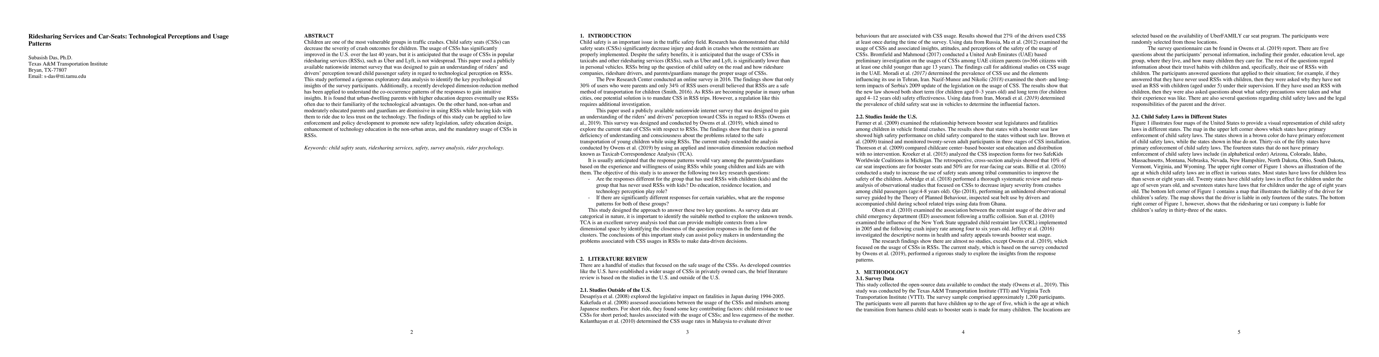 Children are one of the most vulnerable groups in traffic crashes. Child safety seats (CSSs) can decrease the severity of crash outcomes for children. The usage of CSSs has significantly improved in the U.S. over the last 40 years, but it is anticipated that the usage of CSSs in popular ridesharing services (RSSs), such as Uber and Lyft, is not widespread. This paper used a publicly available nationwide internet survey that was designed to gain an understanding of riders and drivers perception toward child passenger safety in regard to technological perception on RSSs. This study performed a rigorous exploratory data analysis to identify the key psychological insights of the survey participants. Additionally, a recently developed dimension-reduction method has been applied to understand the co-occurrence patterns of the responses to gain intuitive insights. It is found that urban-dwelling parents with higher education degrees eventually use RSSs often due to their familiarity of the technological advantages. On the other hand, non-urban and moderately educated parents and guardians are dismissive in using RSSs while having kids with them to ride due to less trust on the technology.