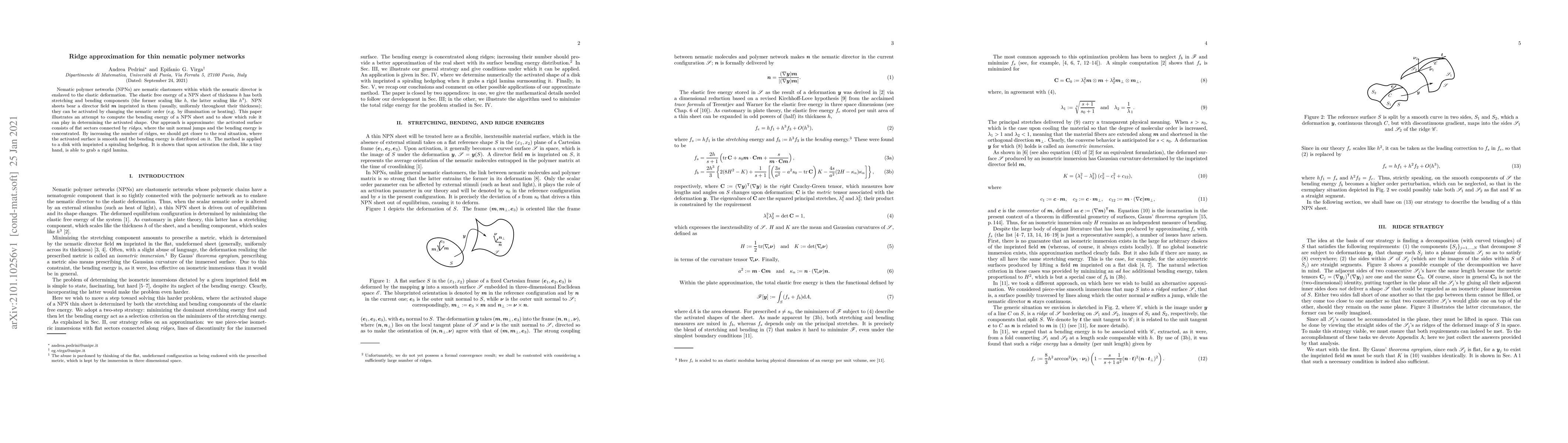 Nematic polymer networks (NPNs) are nematic elastomers within which the nematic director is enslaved to the elastic deformation. The elastic free energy of a NPN sheet of thickness $h$ has both stretching and bending components (the former scaling like h, the latter scaling like $h^3$). NPN sheets bear a director field $\mathbf{m}$ imprinted in them (usually, uniformly throughout their thickness); they can be activated by changing the nematic order (e.g. by illumination or heating). This paper illustrates an attempt to compute the bending energy of a NPN sheet and to show which role it can play in determining the activated shape. Our approach is approximate: the activated surface consists of flat sectors connected by ridges, where the unit normal jumps and the bending energy is concentrated. By increasing the number of ridges, we should get closer to the real situation, where the activated surface is smooth and the bending energy is distributed on it. The method is applied to a disk with imprinted a spiraling hedgehog. It is shown that upon activation the disk, like a tiny hand, is able to grab a rigid lamina.